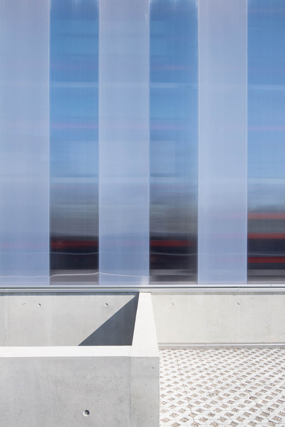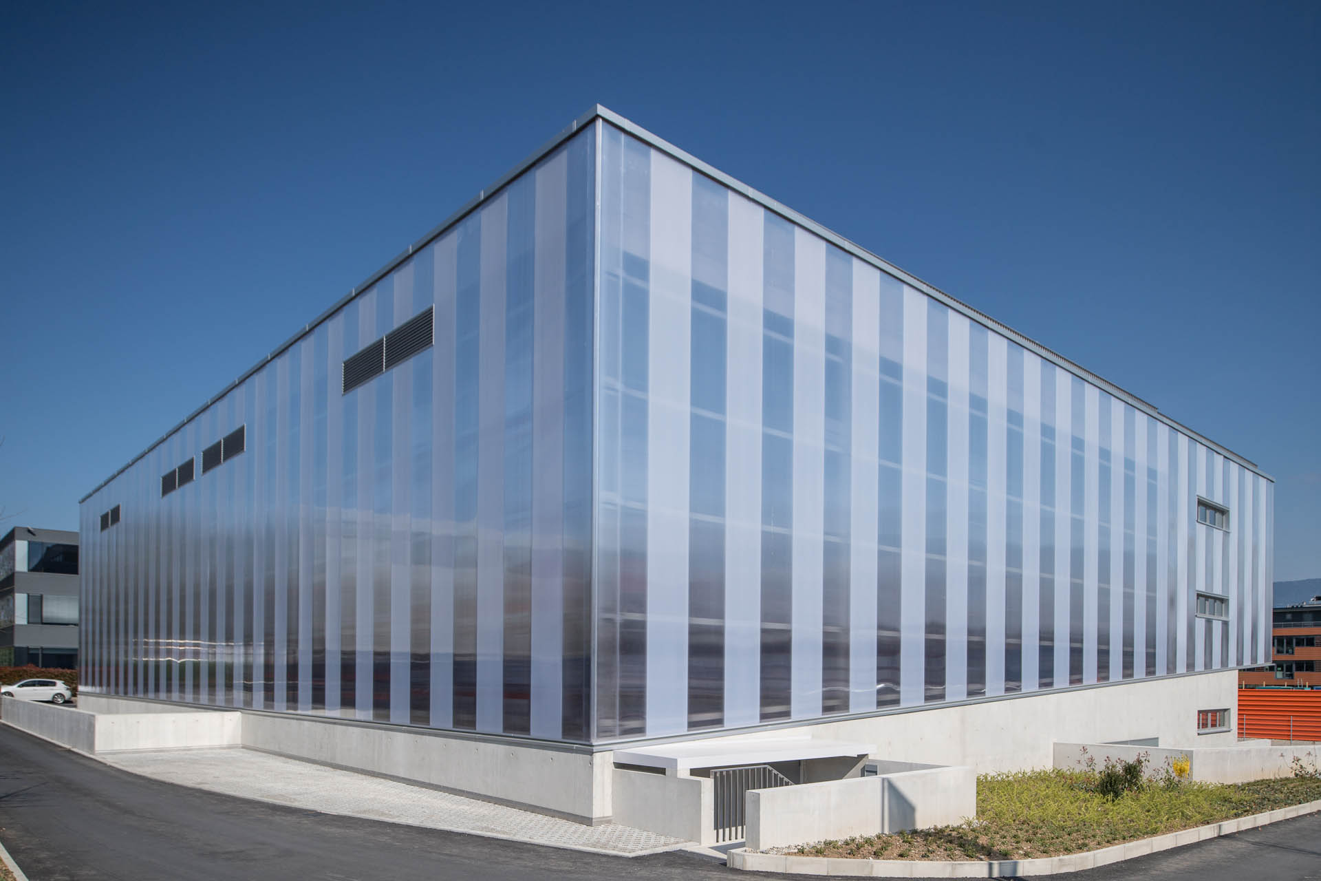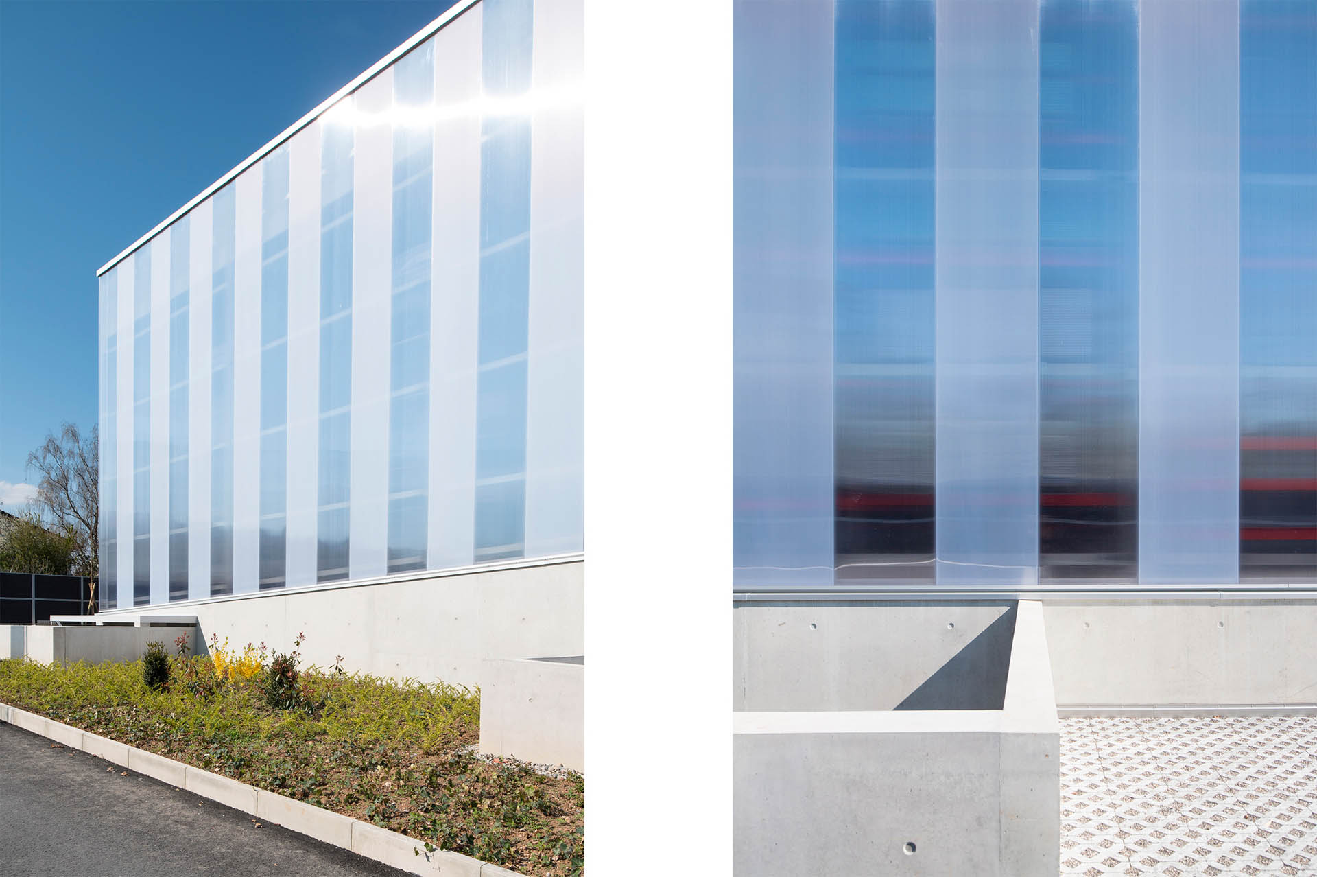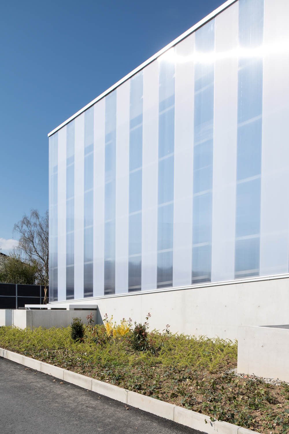 Le bâtiment, édifié dans la pente naturelle du terrain, intègre dans sa partie inférieure, un généreux porte à faux abritant le quai de déchargement de l’entreprise. Le soubassement en béton banché épouse la pente et se déploie en murets qui guident le cheminement. Il apparait comme un socle, pour cette façade légère et translucide en polycarbonate. Un jeu sur les opacités a été imaginé, afin de créer un effet de bandes verticales, tout en répondant au besoin d’éclairage naturel.