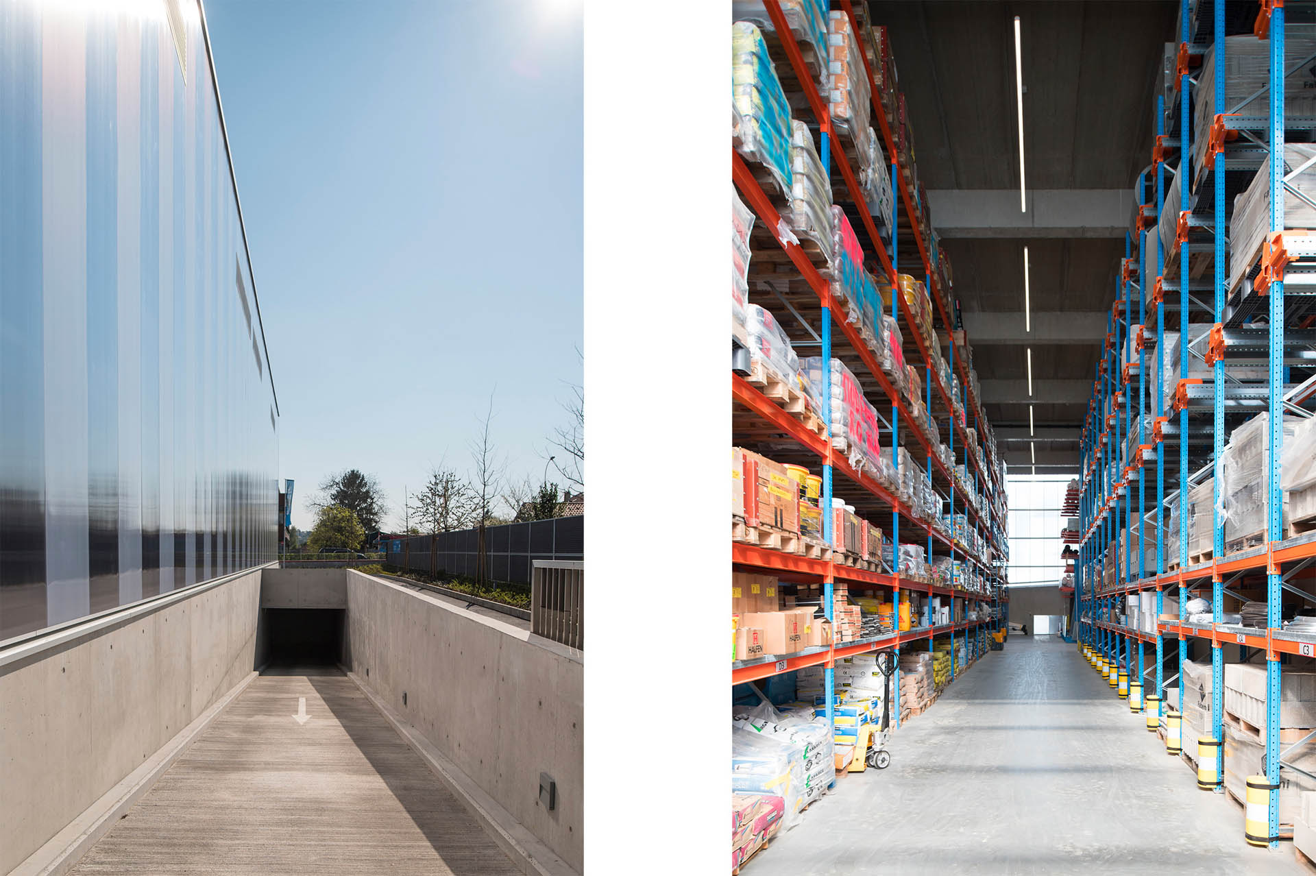 L’étroite collaboration architecte – ingénieur, a permis la résolution d’un système statique permettant la création d’une halle de stockage logistique de plus de 1’000 m2 et de 10 mètres de haut, ainsi que d’une quincaillerie, un showroom et des surfaces disponibles au grès du preneur.