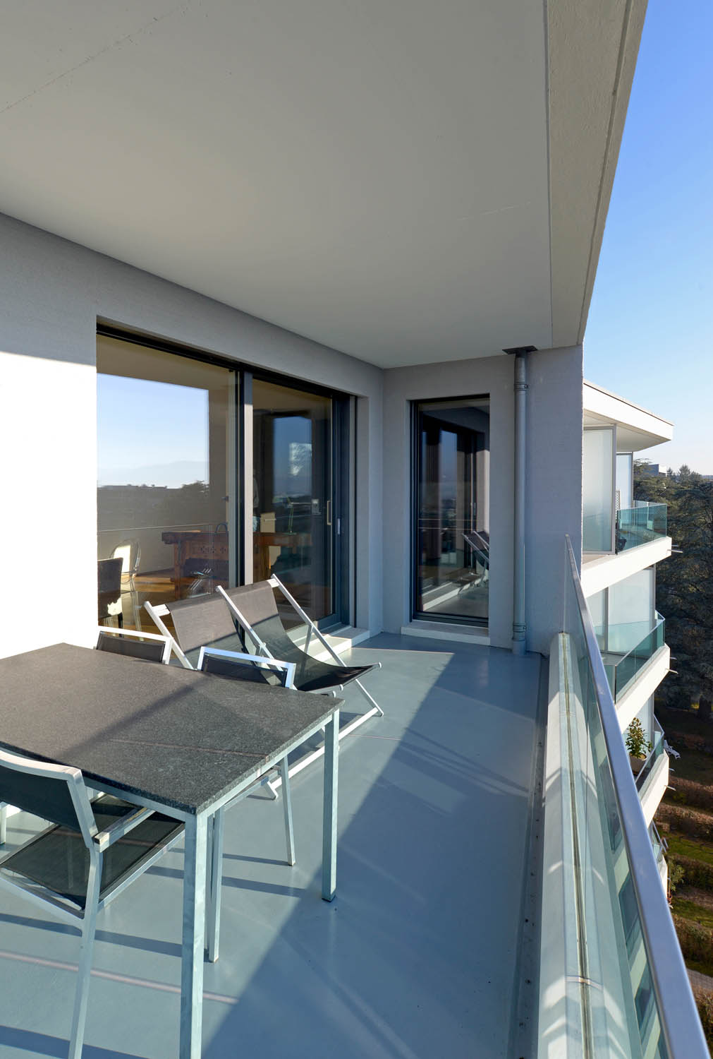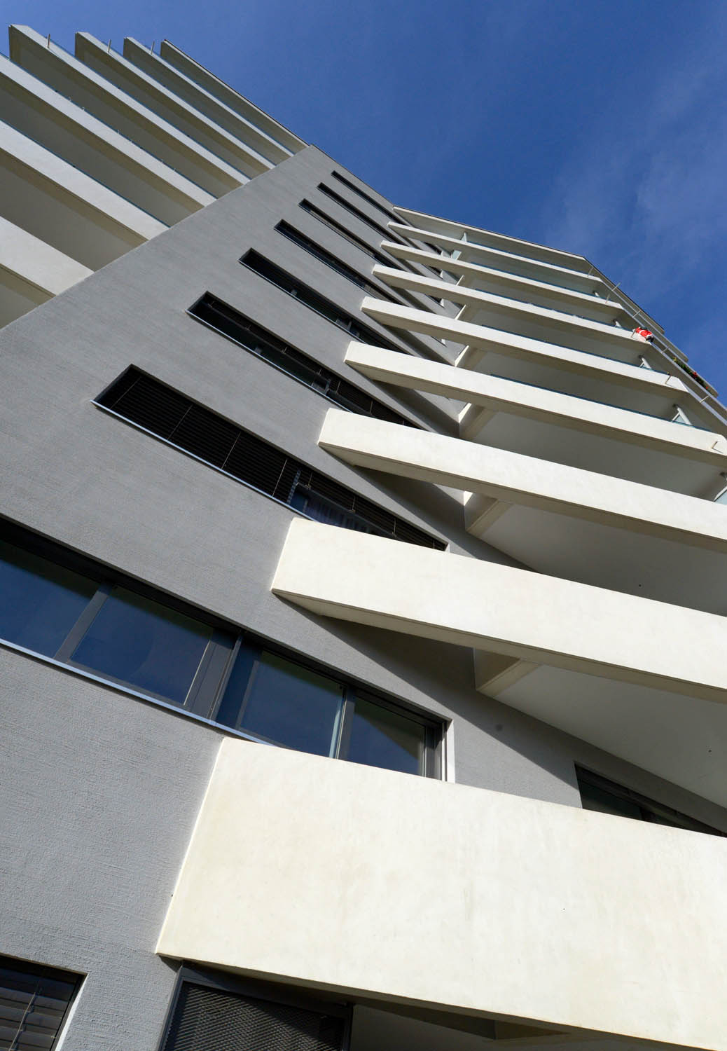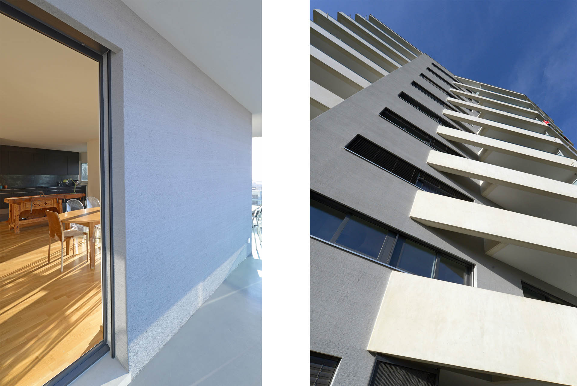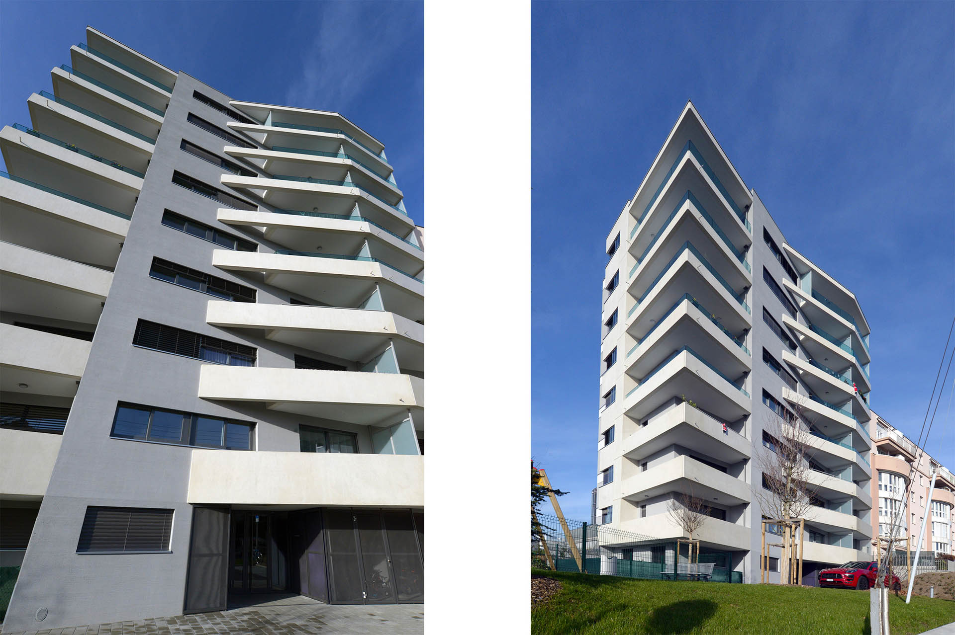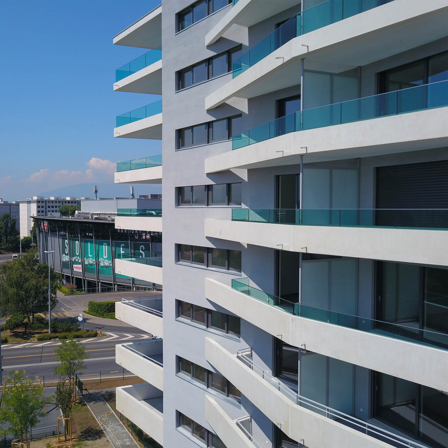 Les vitrages des garde-corps, insérés dans les parapets de balcons augmente en hauteur avec les étages alors que diminue celle du parapet en ciment blanc, donnant un effet de dynamisme et de légèreté au bâtiment. En plus de renforcer l’effet élancé du bâtiment, la réflexion autour de ce détail permet aussi par un jeu de perspective, de masquer les aménagements sur les balcons.