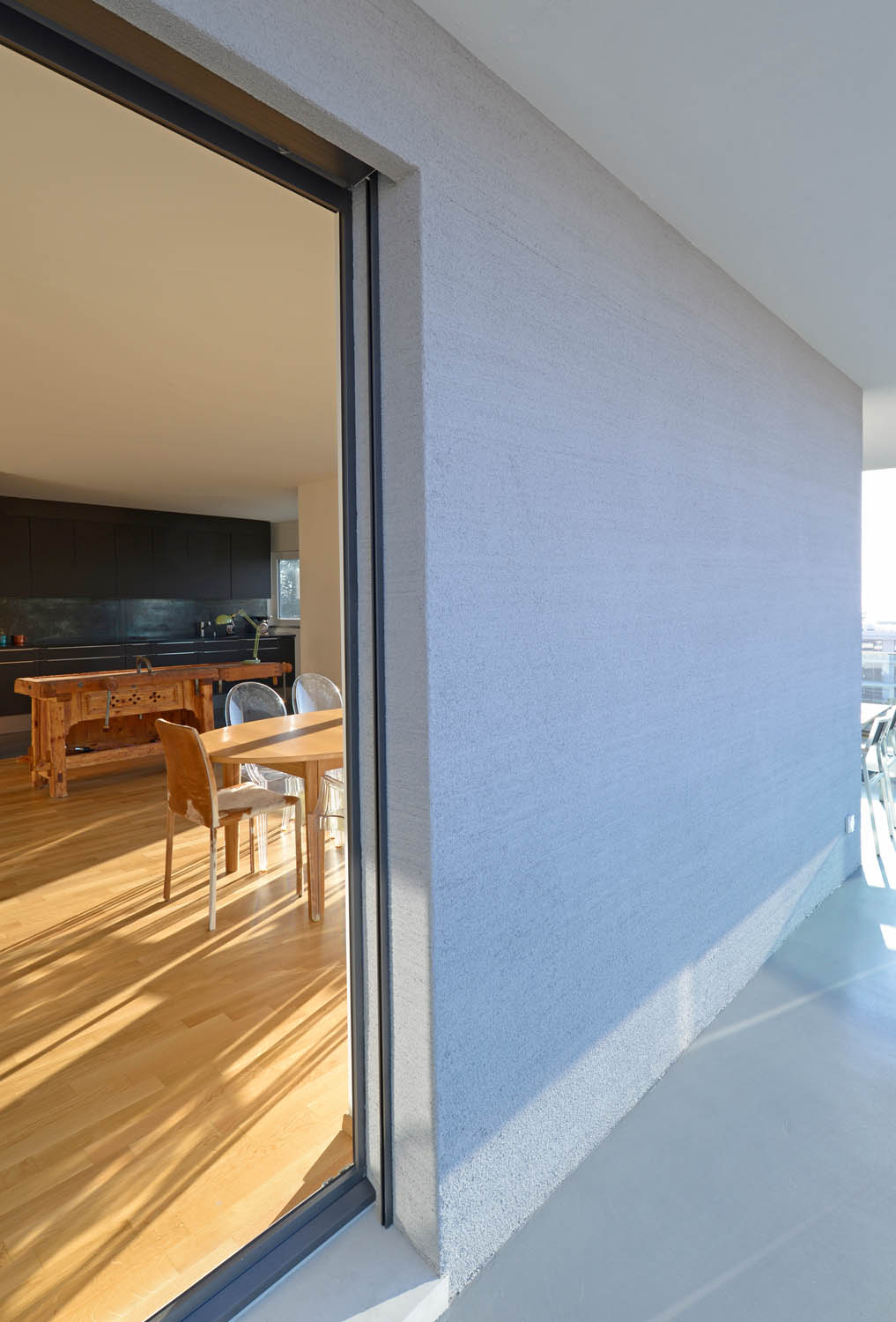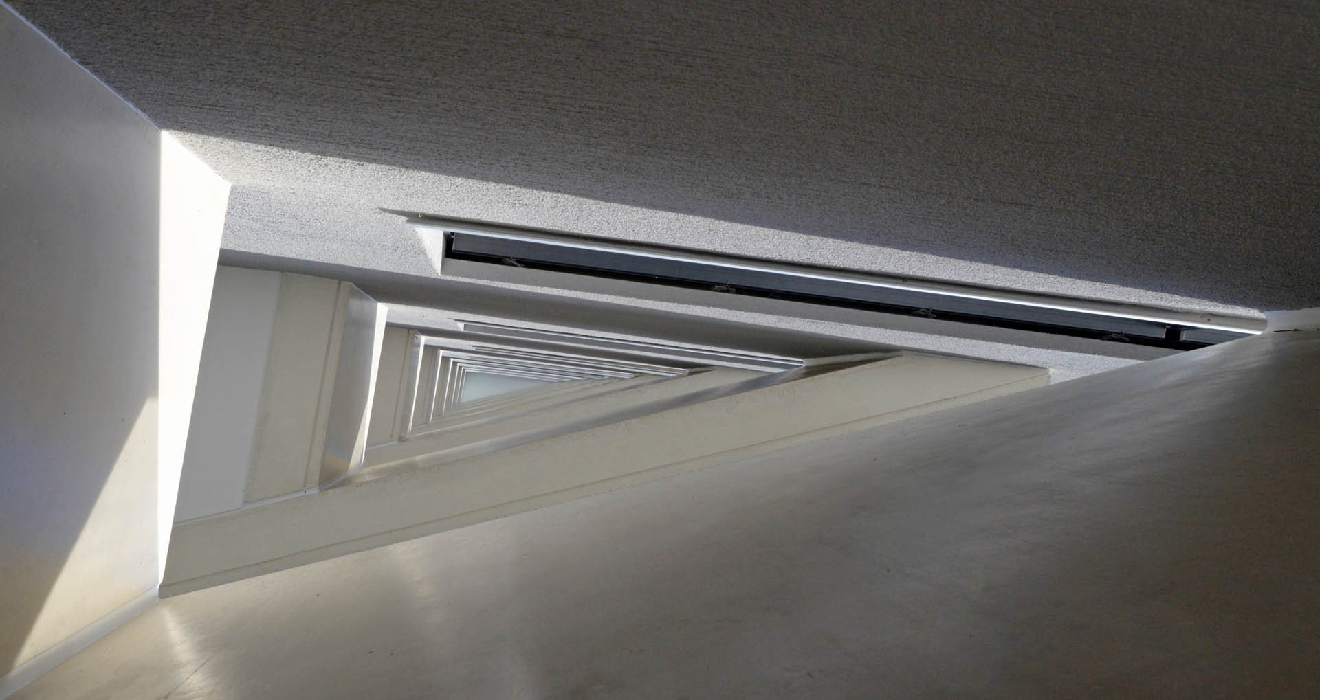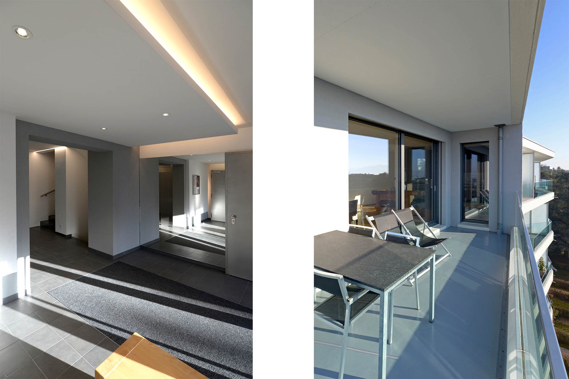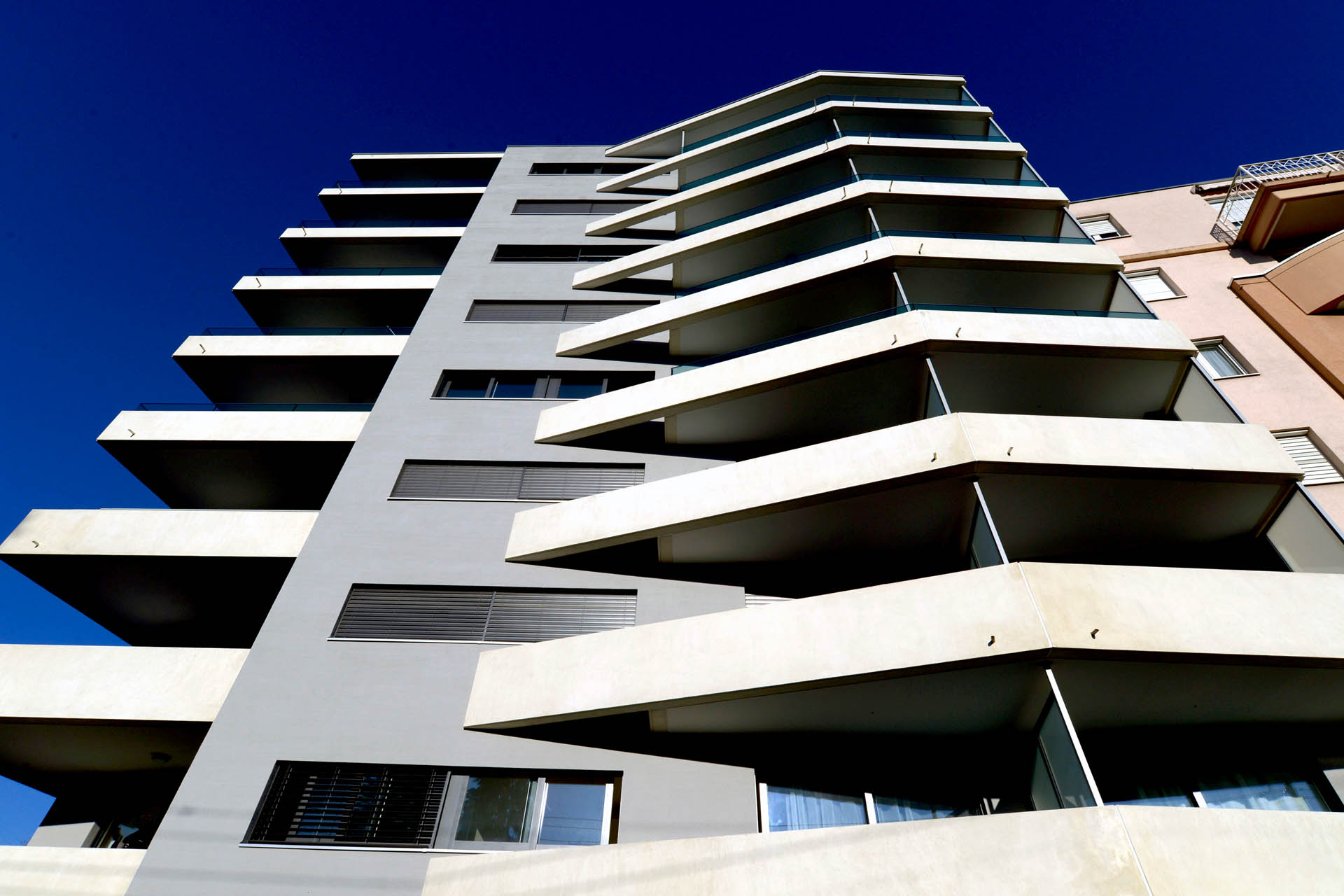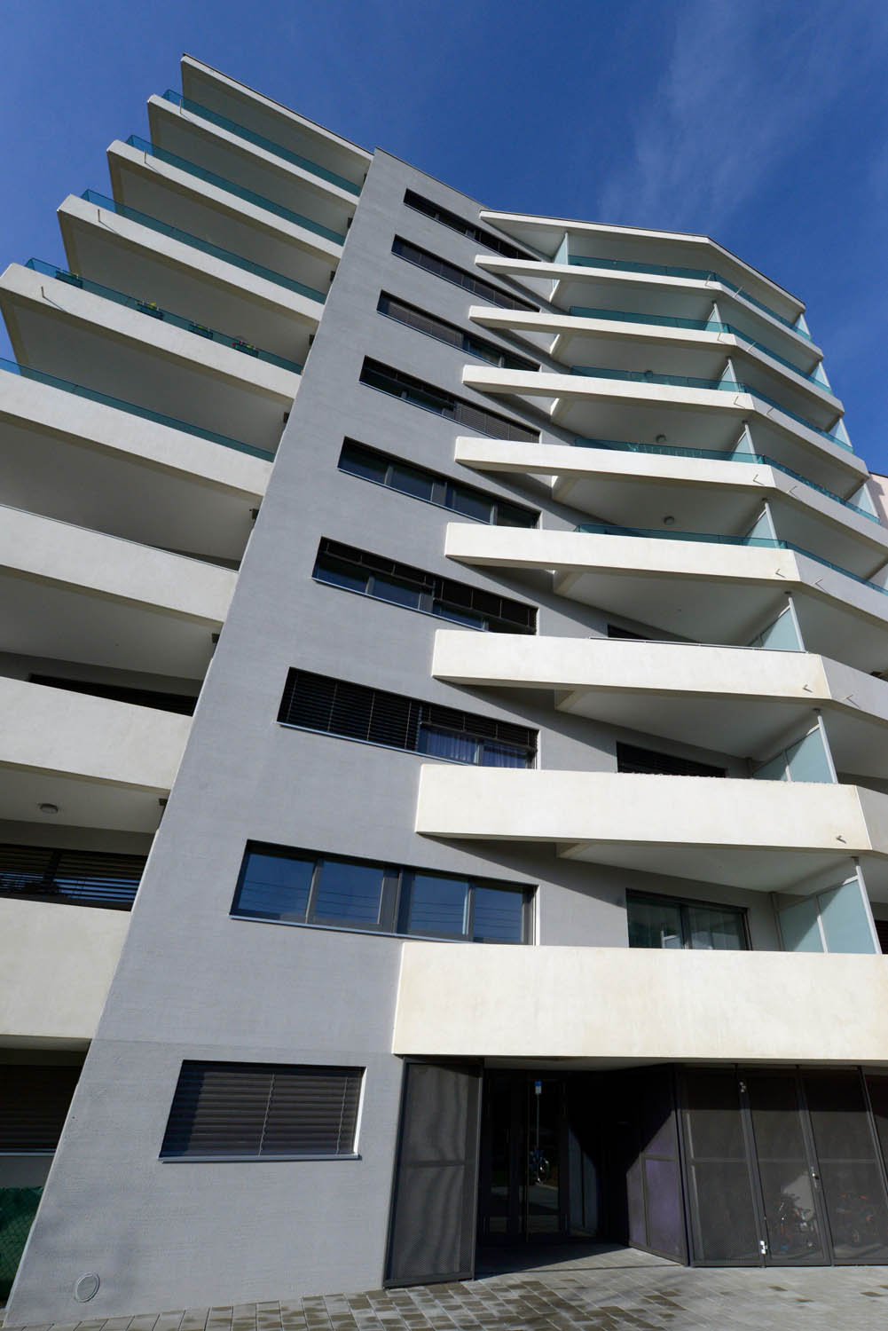 Les vitrages des garde-corps, insérés dans les parapets de balcons augmente en hauteur avec les étages alors que diminue celle du parapet en ciment blanc, donnant un effet de dynamisme et de légèreté au bâtiment. En plus de renforcer l’effet élancé du bâtiment, la réflexion autour de ce détail permet aussi par un jeu de perspective, de masquer les aménagements sur les balcons.