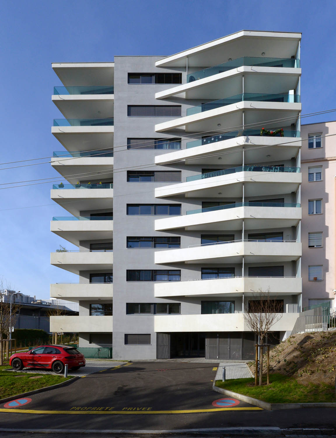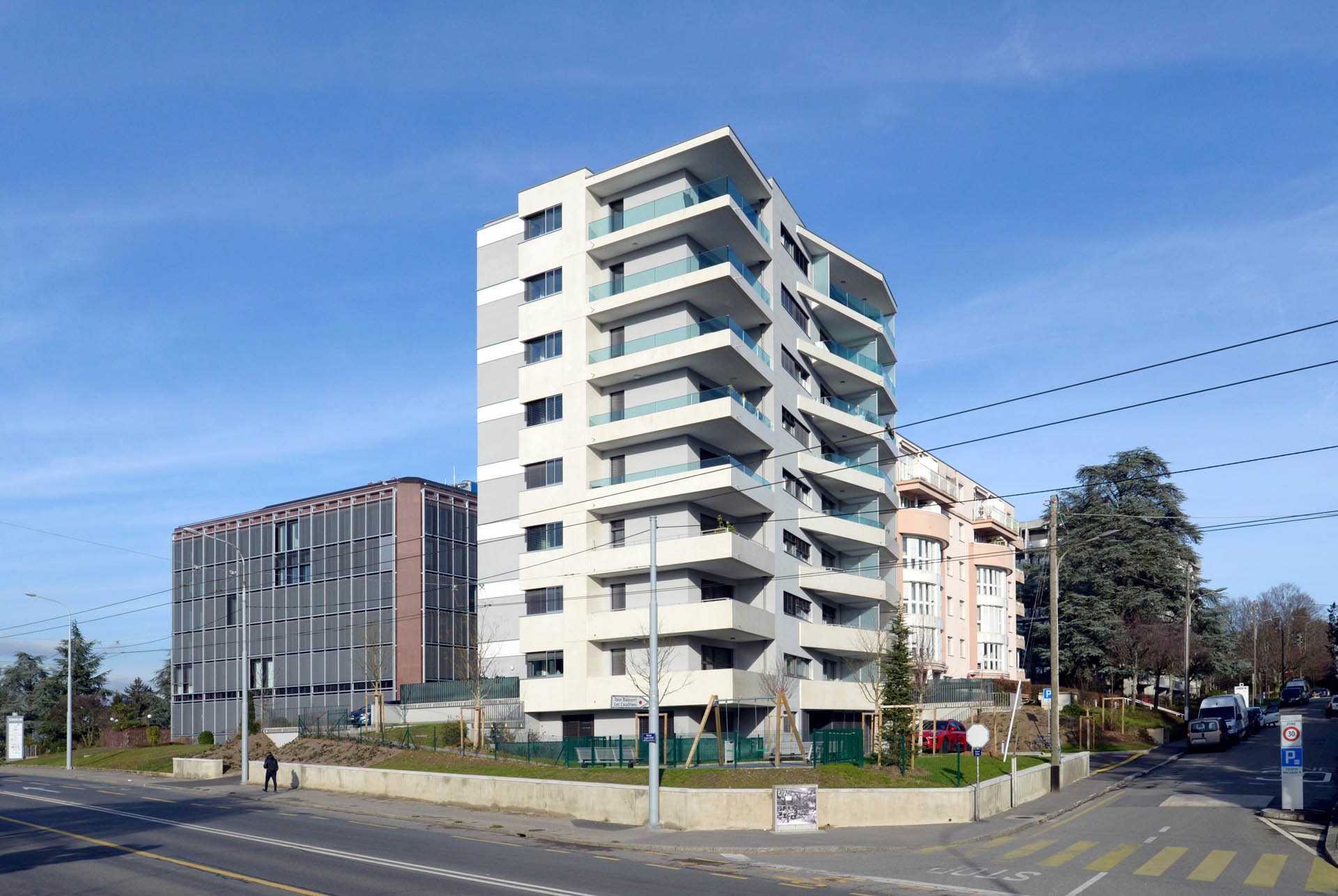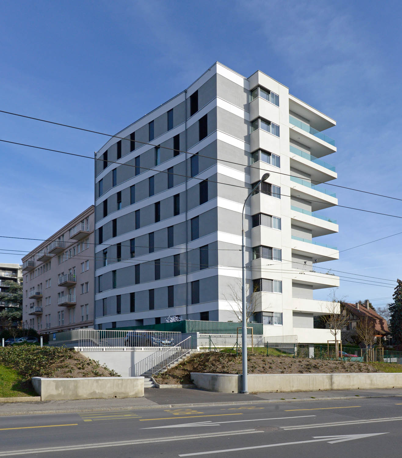 Dans cet immeuble de logement social à l’allure contemporaine, les 15 logements sont destinés à la vente en PPE à un prix moyen très attractif et bénéficient pour les niveaux supérieurs d’une vue dégagée sur le Jet d’eau.