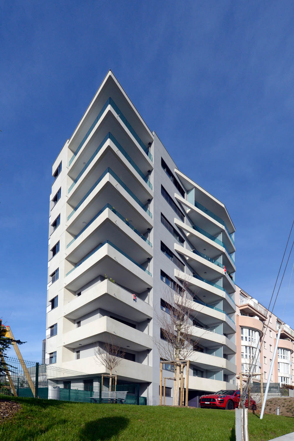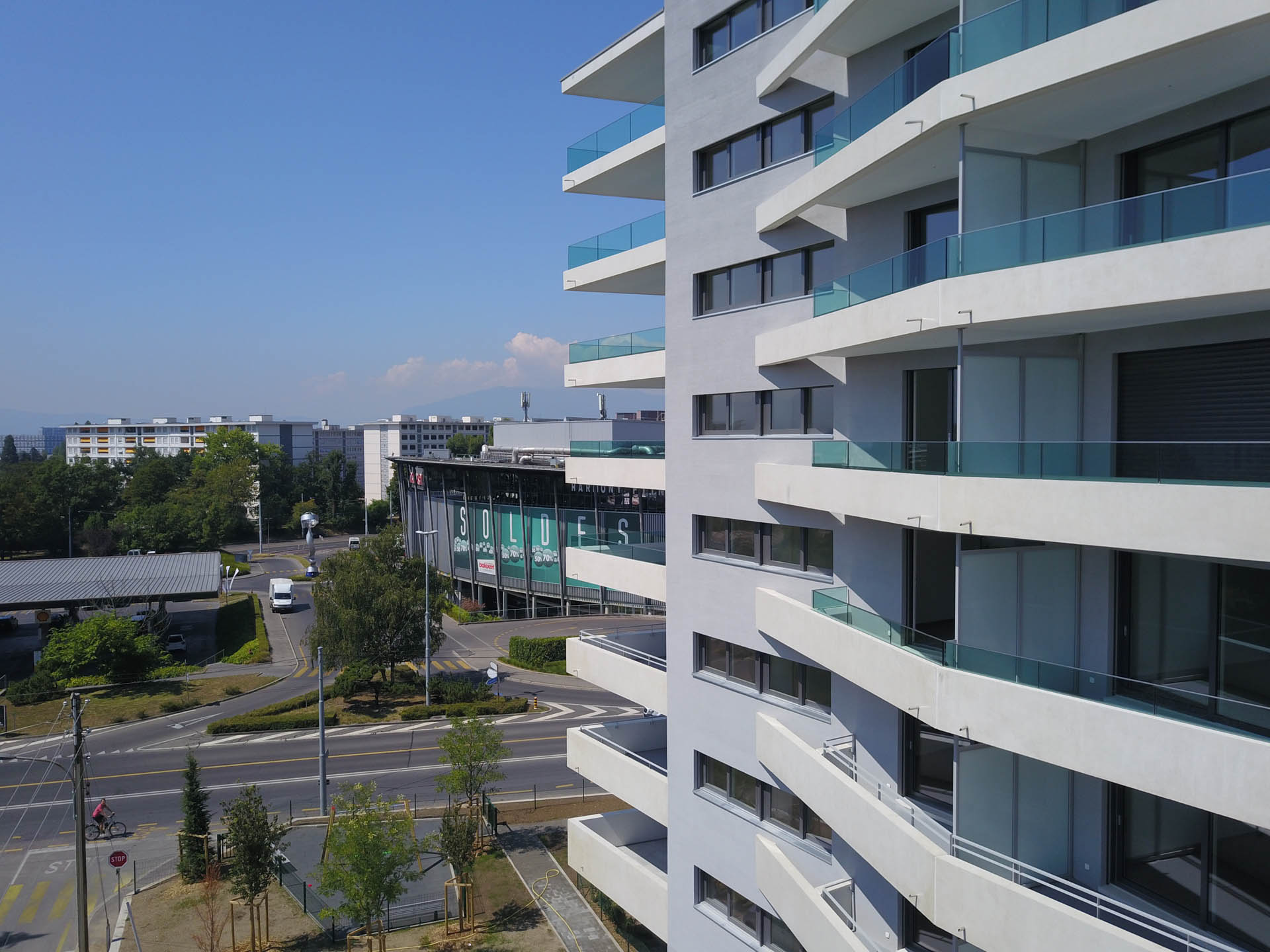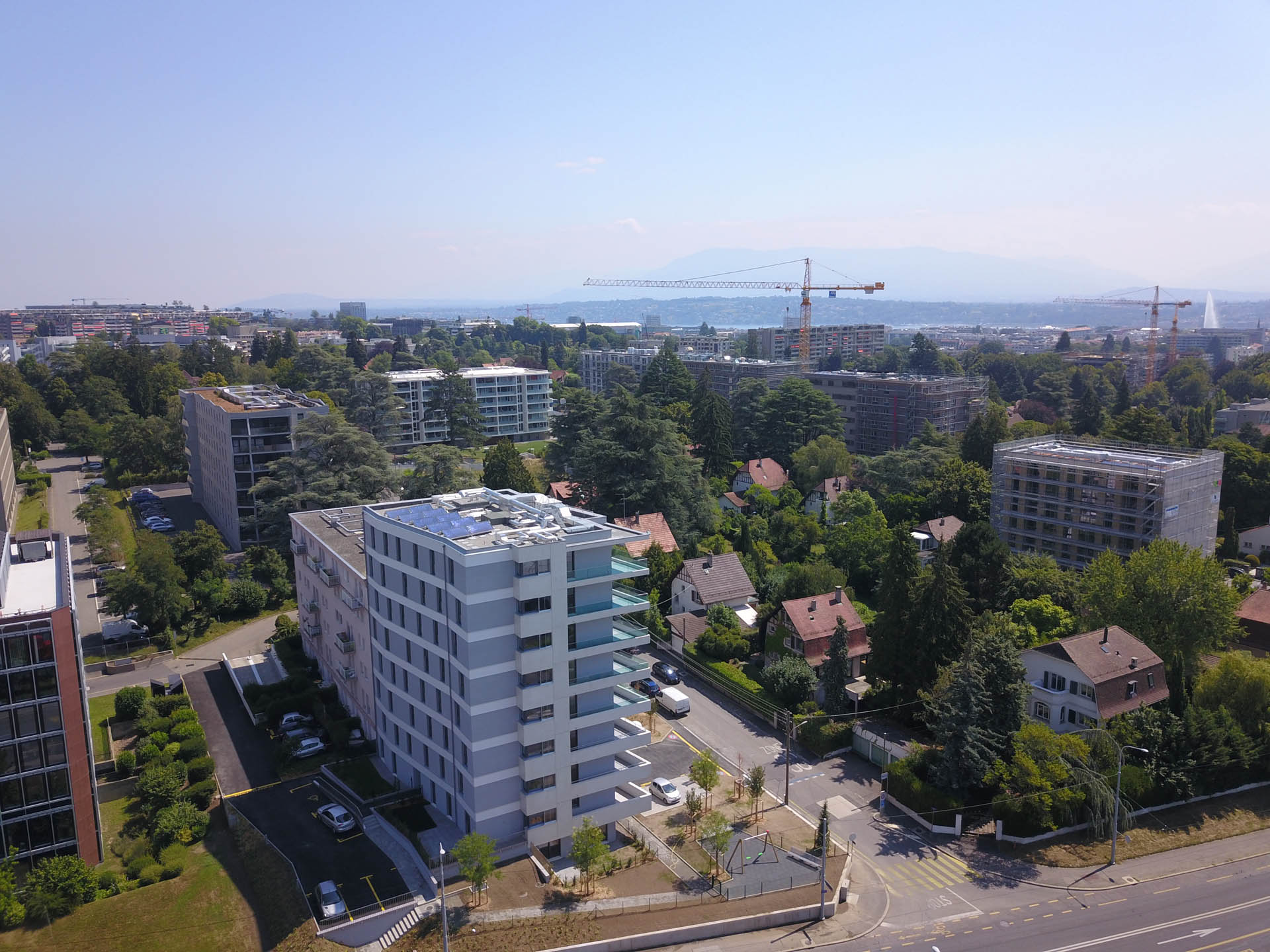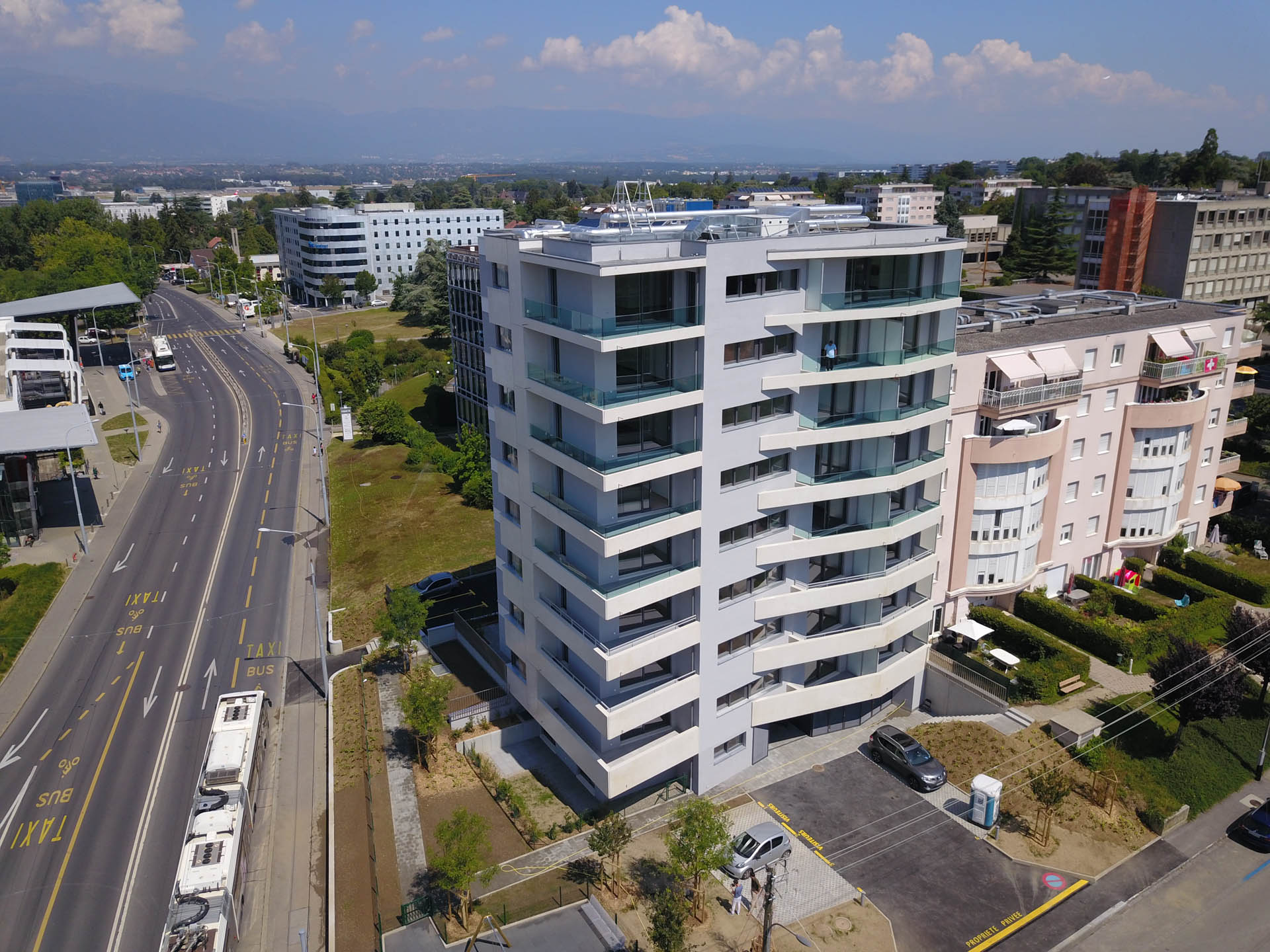 Dans cet immeuble de logement social à l’allure contemporaine, les 15 logements sont destinés à la vente en PPE à un prix moyen très attractif et bénéficient pour les niveaux supérieurs d’une vue dégagée sur le Jet d’eau.