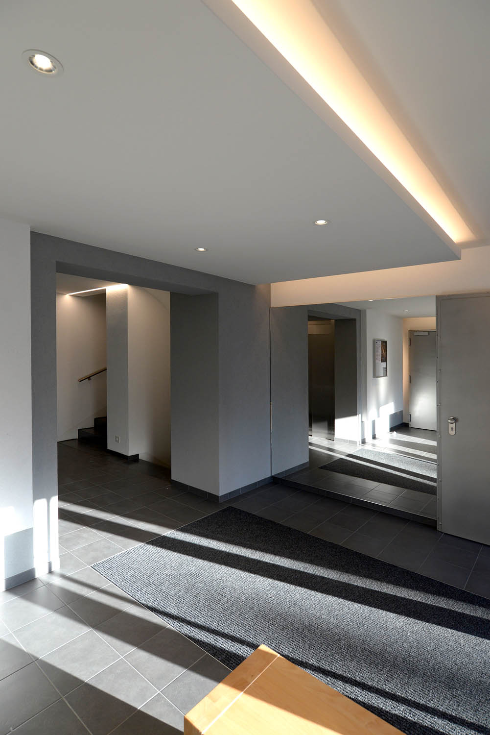 Sur une parcelle paysagée, le bâtiment prend le parti de la densité, avec une emprise au sol de 385 m2 et une face accolée au bâtiment mitoyen, dégageant ainsi des espaces verts, une place de jeux protégée et quatre places de stationnement extérieures.