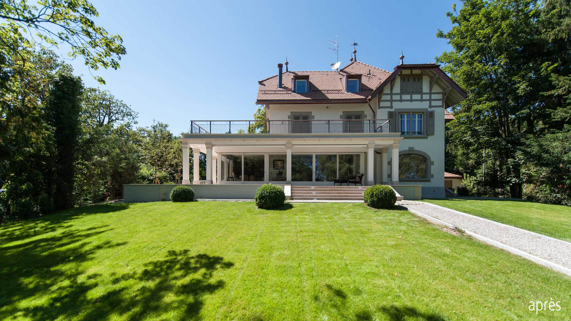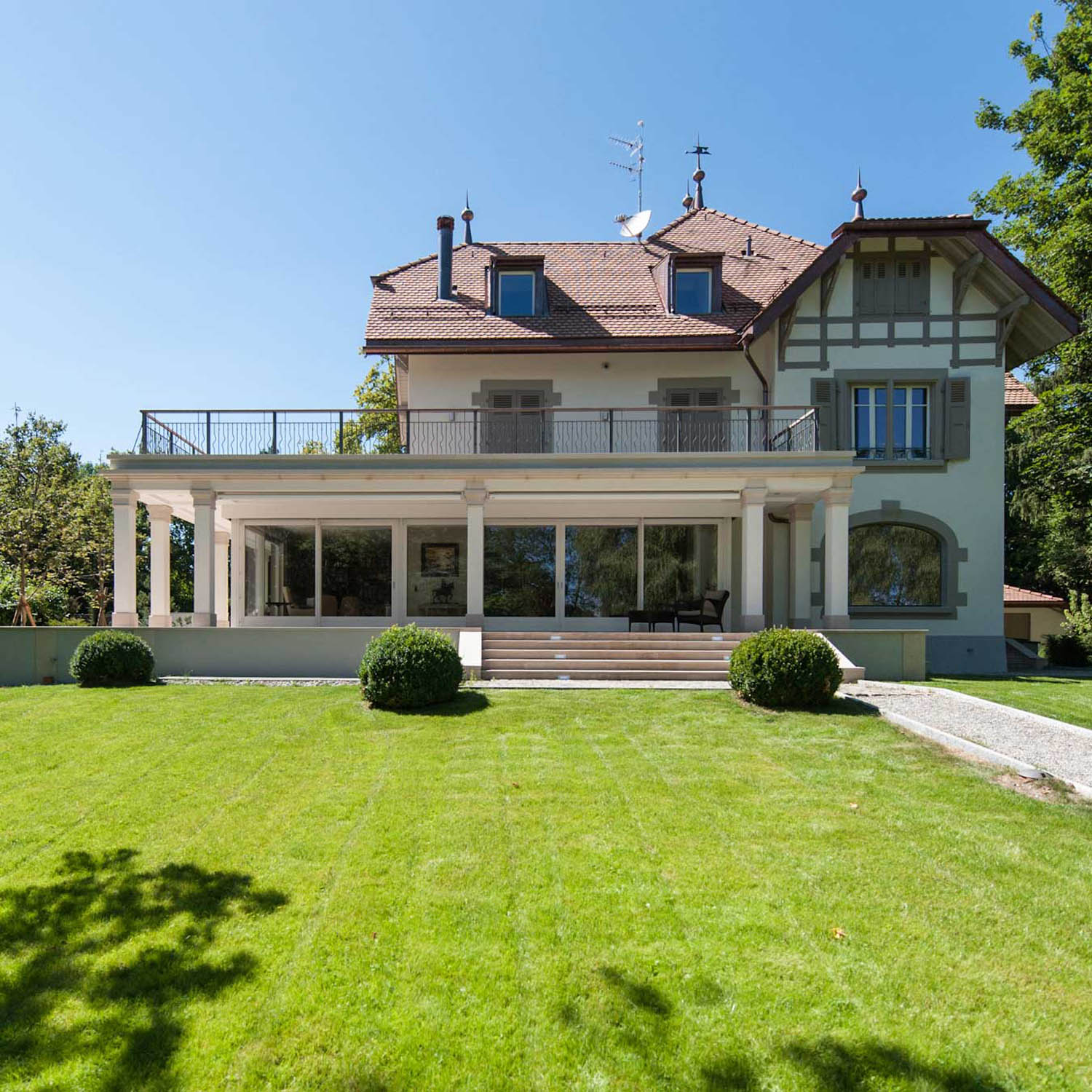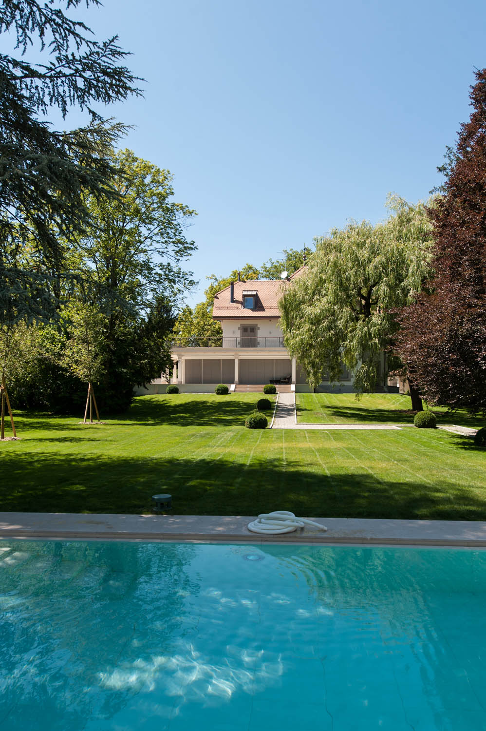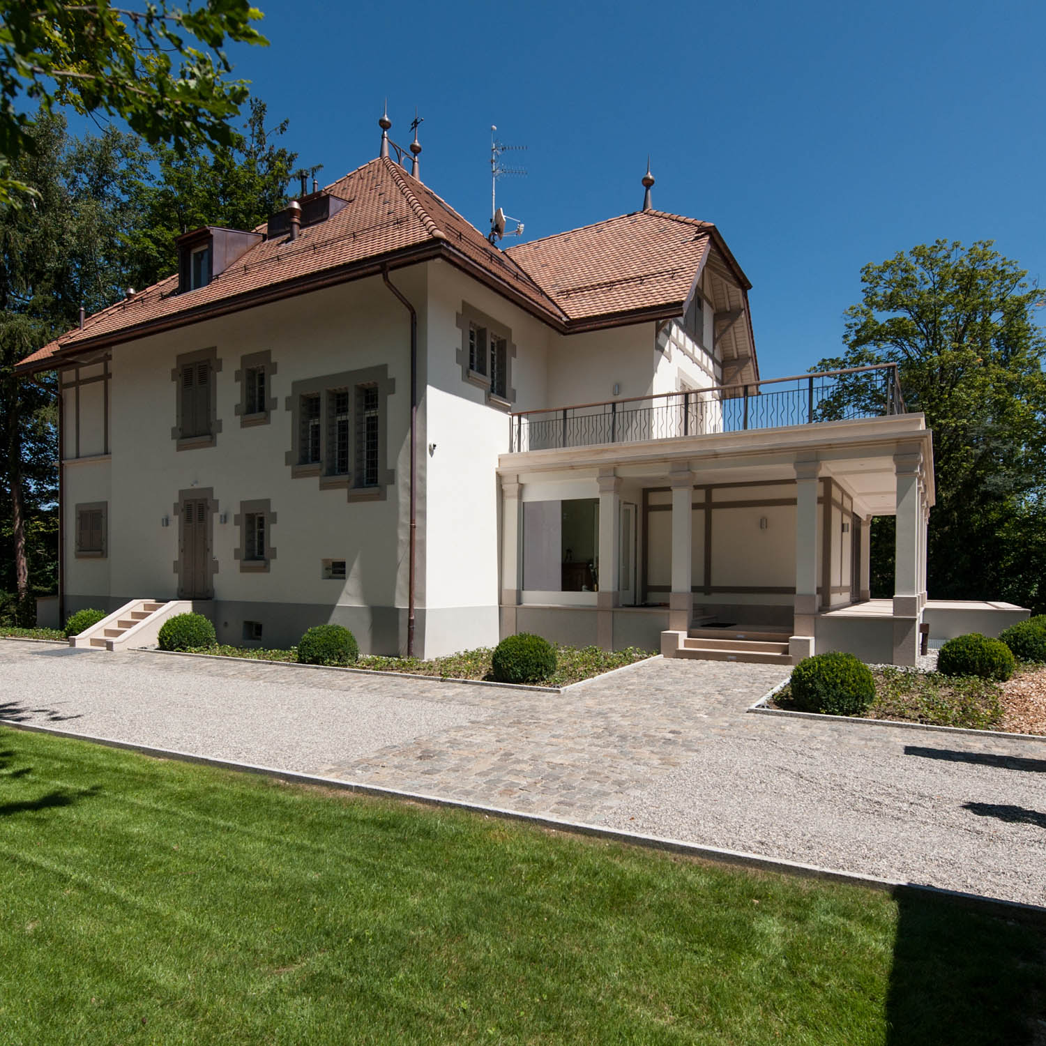 Située en zone villa, cette très belle propriété arborée de 4’125 m² n’avait pas subi de modification depuis les années soixante. La transformation a permis d’agrandir les espaces de jour au rez-de-chaussée, d’ajouter une chambre et une salle de bain aux étages, et de presque doubler la surface des sous-sols.