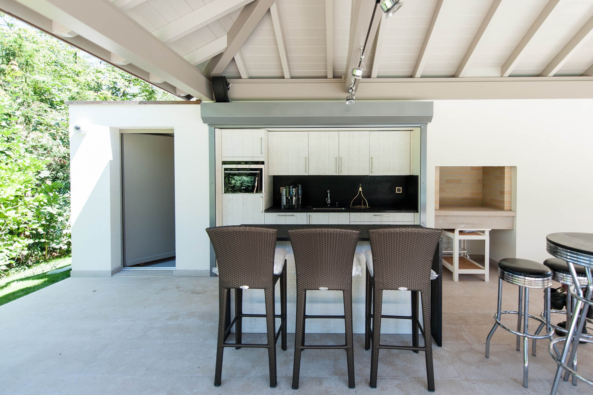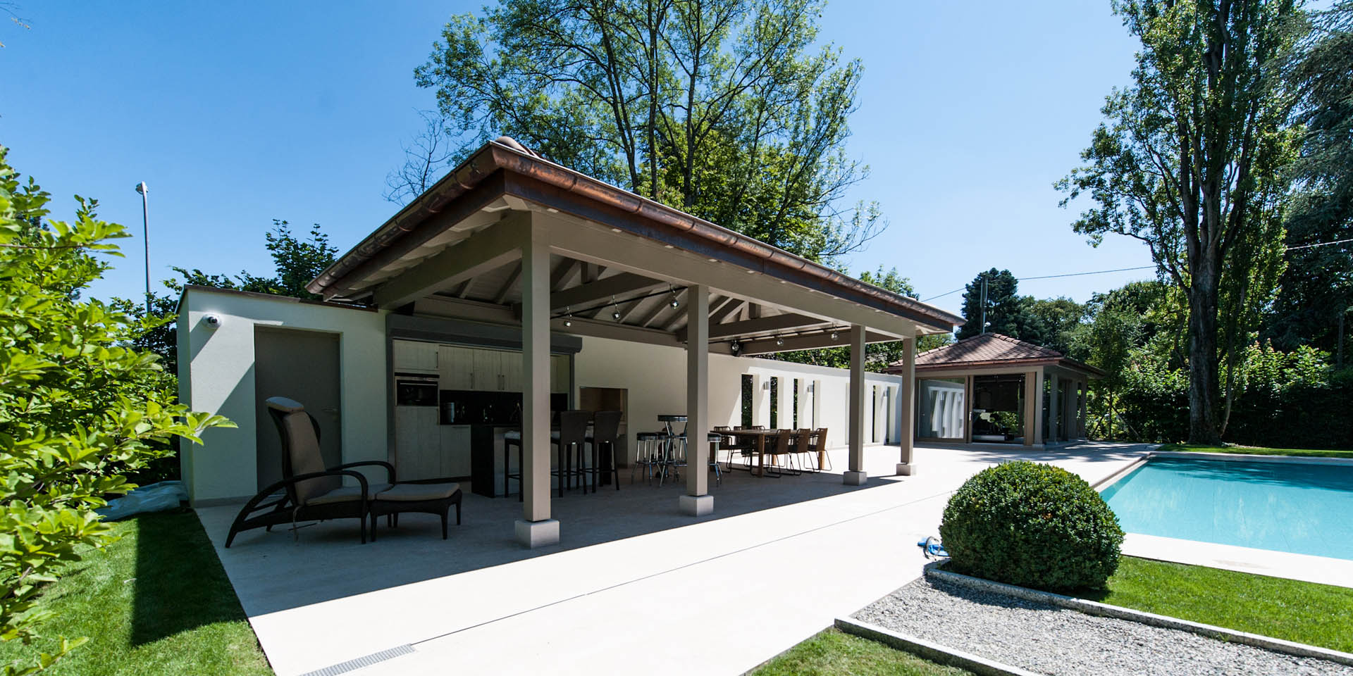 La piscine existante en fond de jardin reçoit deux volumes reliés, par un mur faisant trait d’union. D’un côté se situe une terrasse couverte et sa cuisinette, de l’autre le fitness et une salle d’eau.