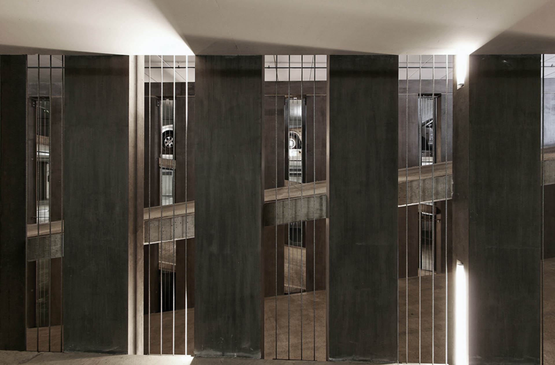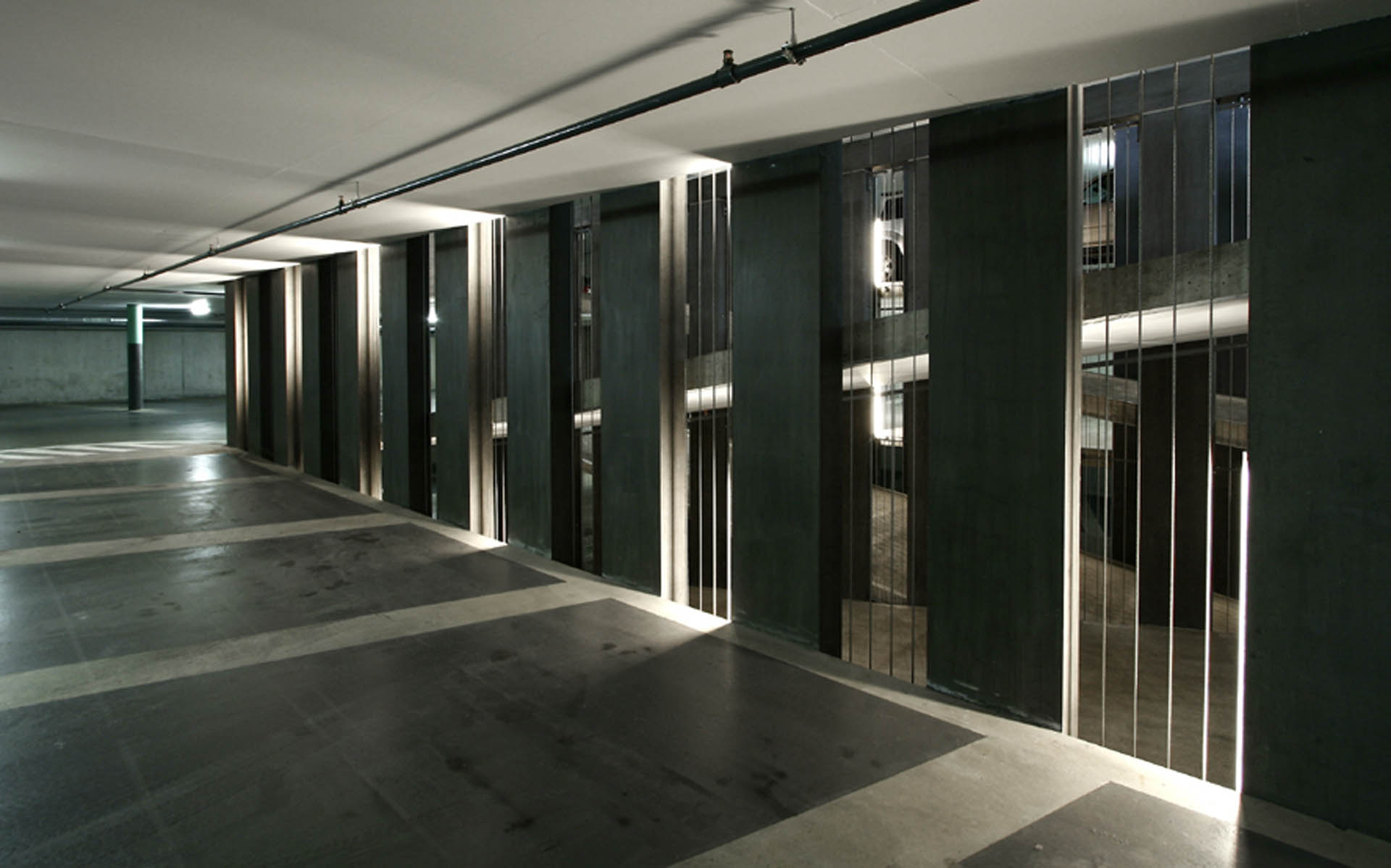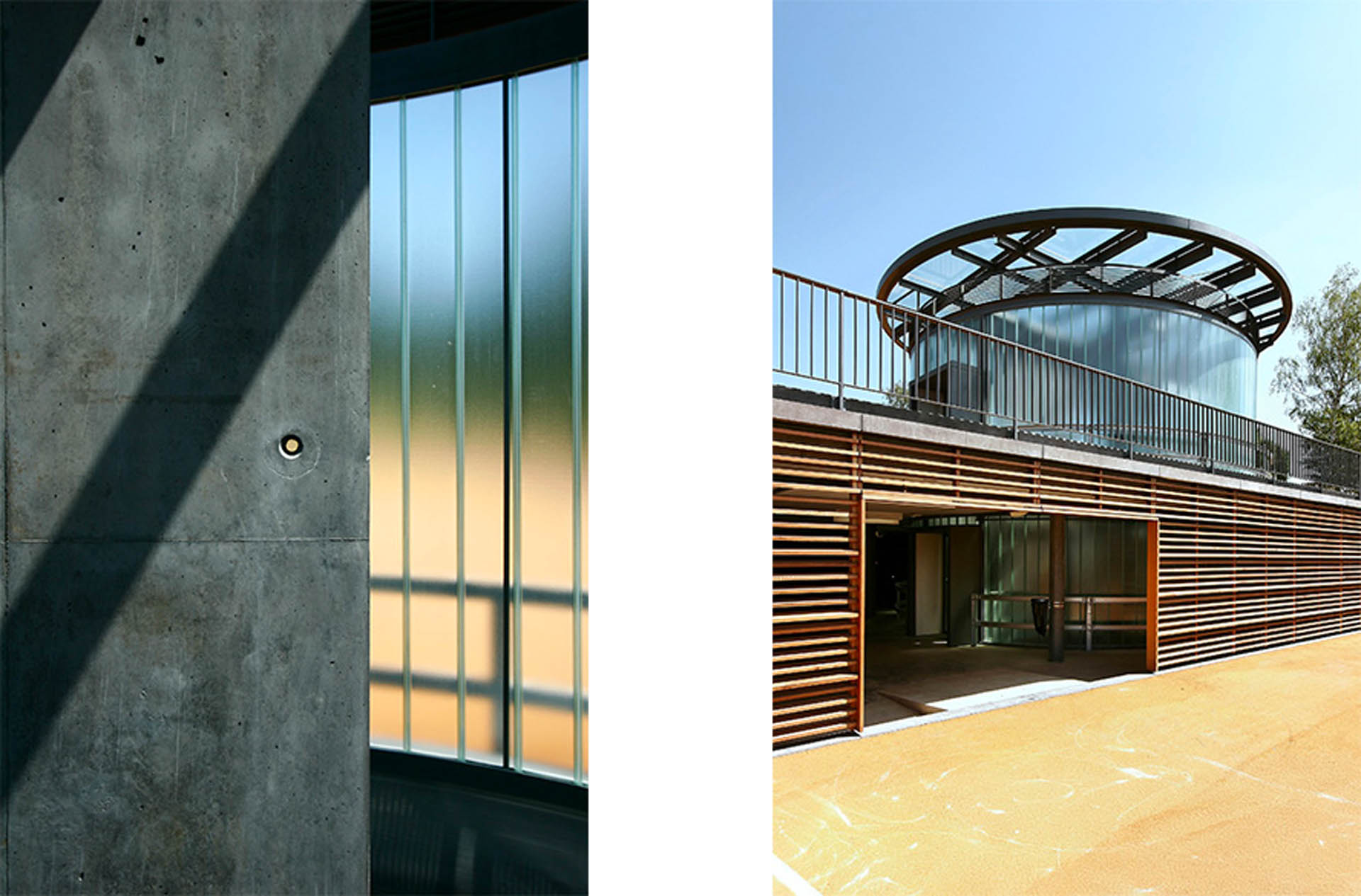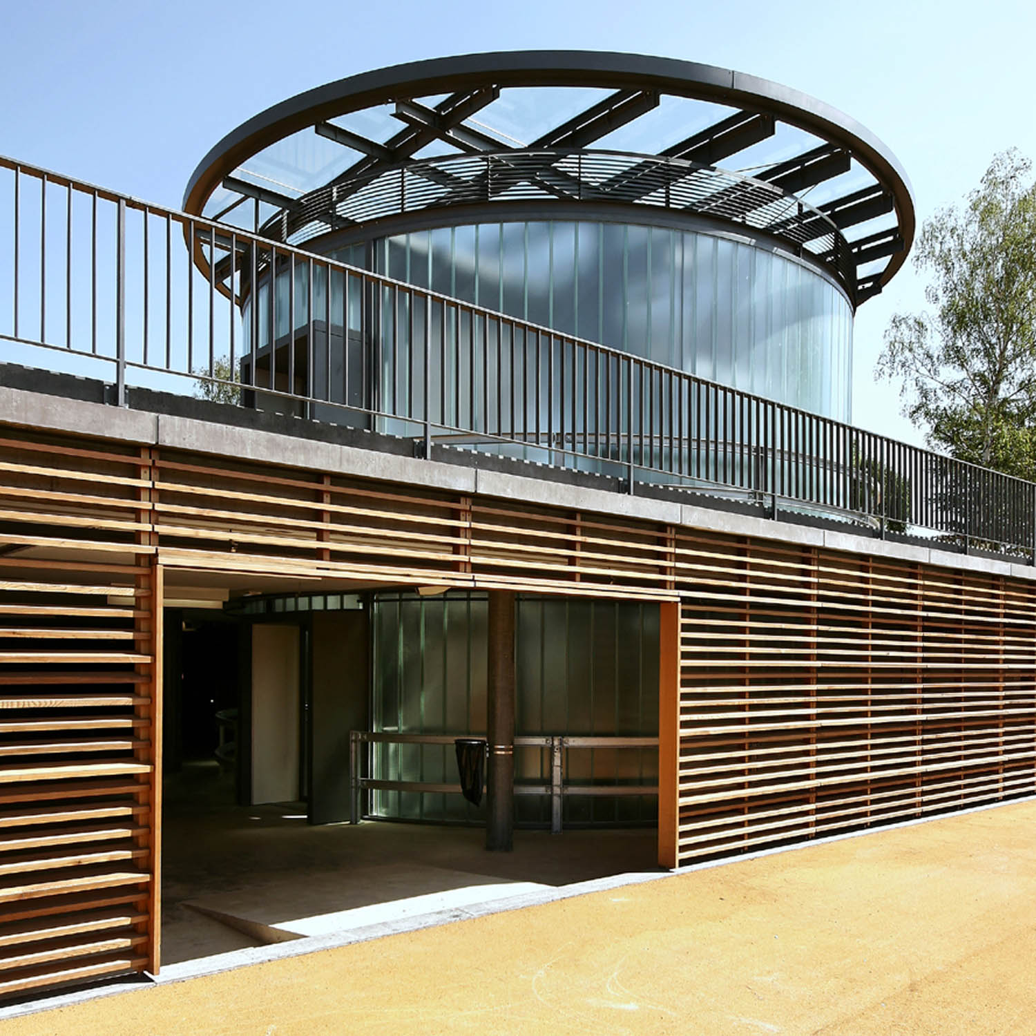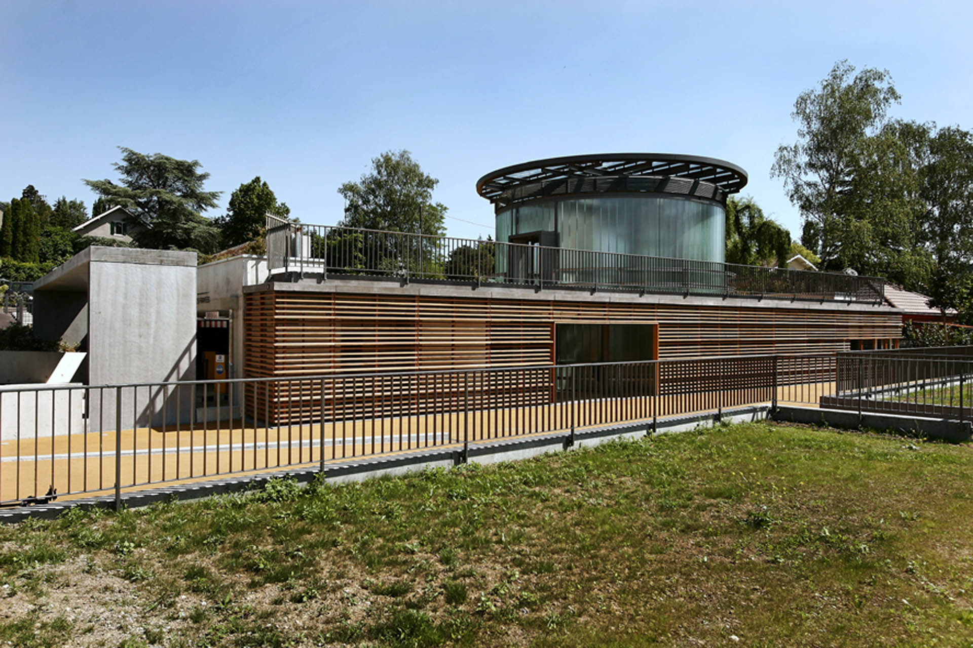 Ce signal émerge d’un long socle dans lequel s’ouvre les accès véhicules. Ses murs de béton sont garnis par un clayonnage en bois de cèdre, trait d’union avec l’espace de jeu voisin, favorisant la perception d’un élancement horizontal.