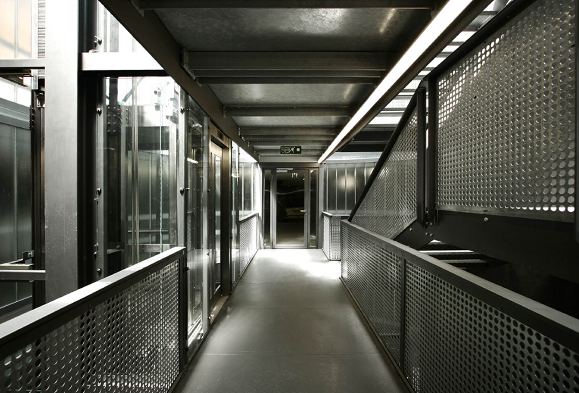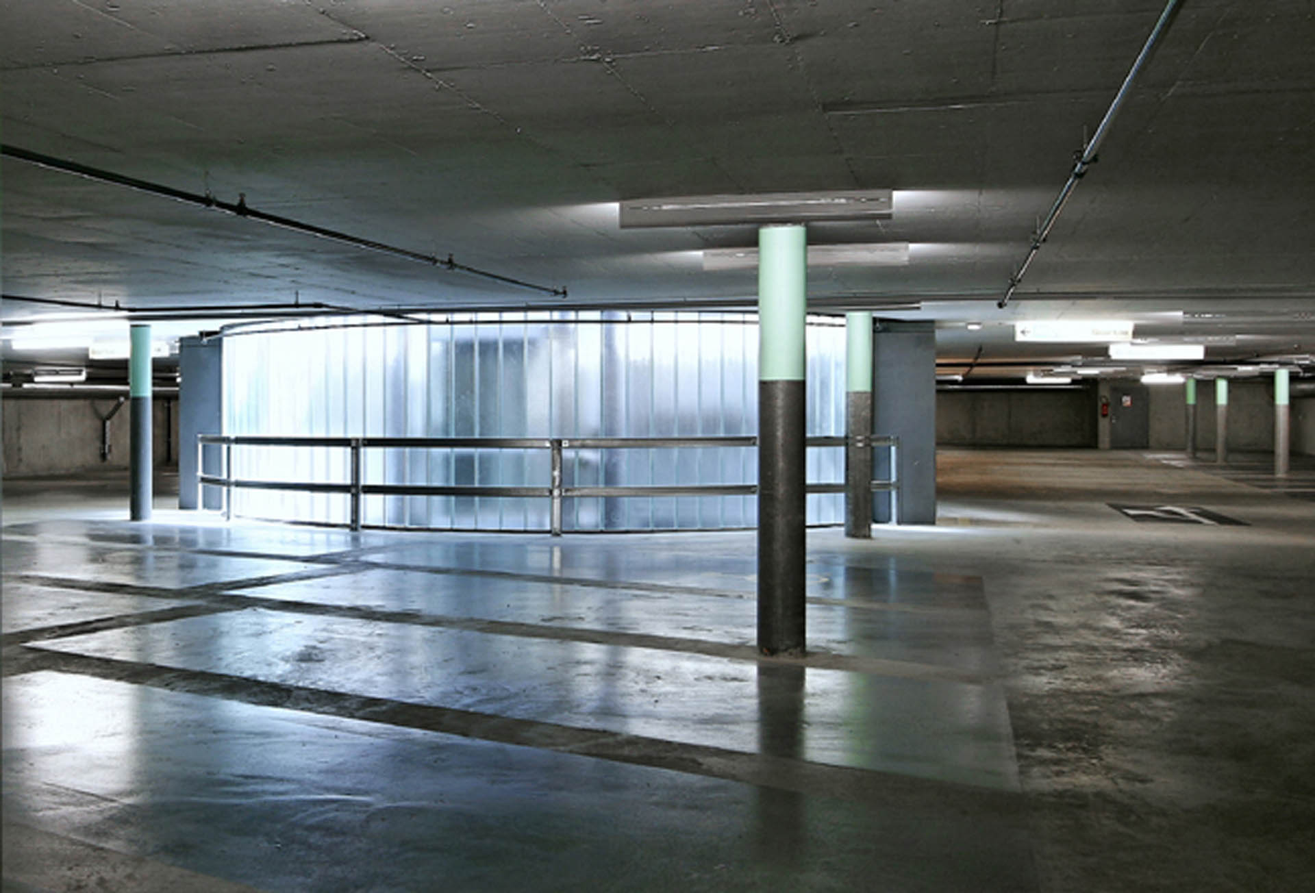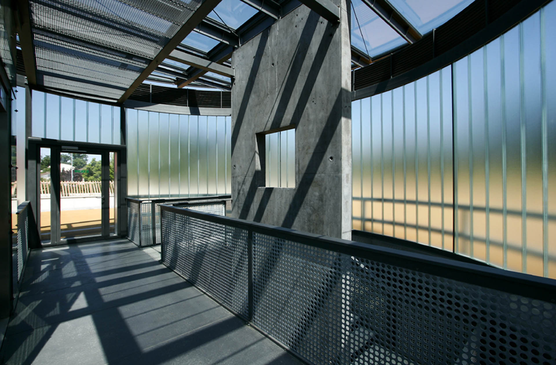 Ainsi, le noyau central distributif constitue-t-il le repère vertical évident pour les accès piétons: réalisé en verre et métal, il se distingue par sa volumétrie cylindrique en métal.
