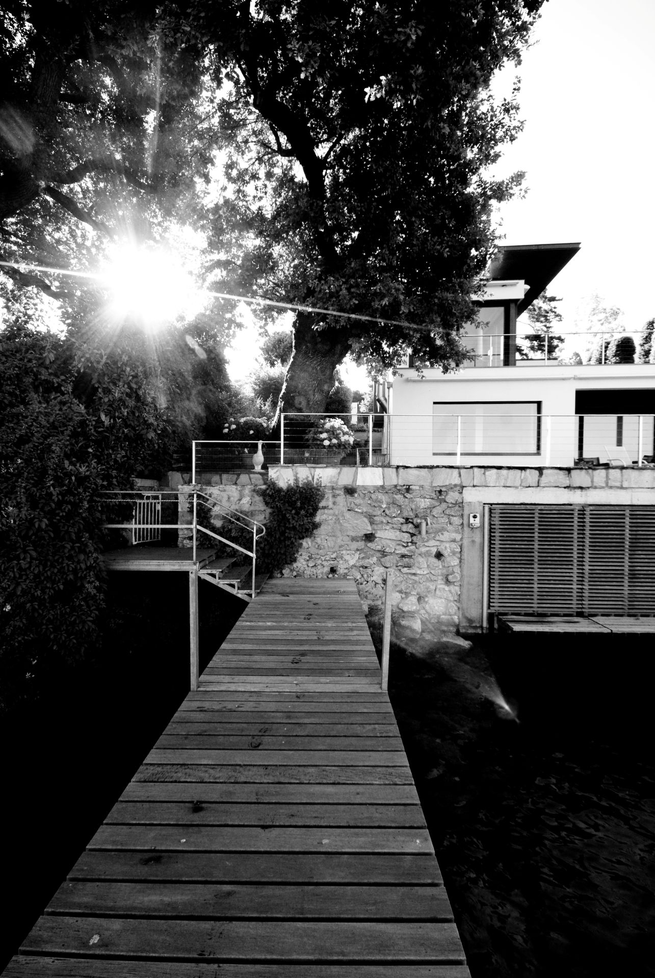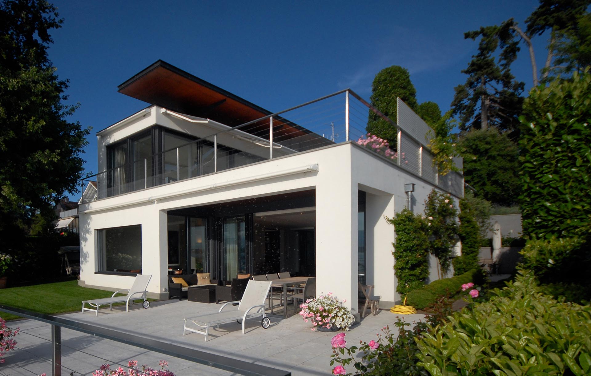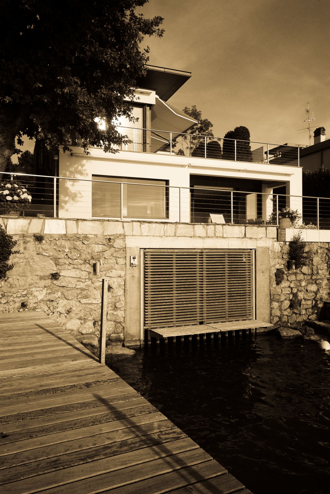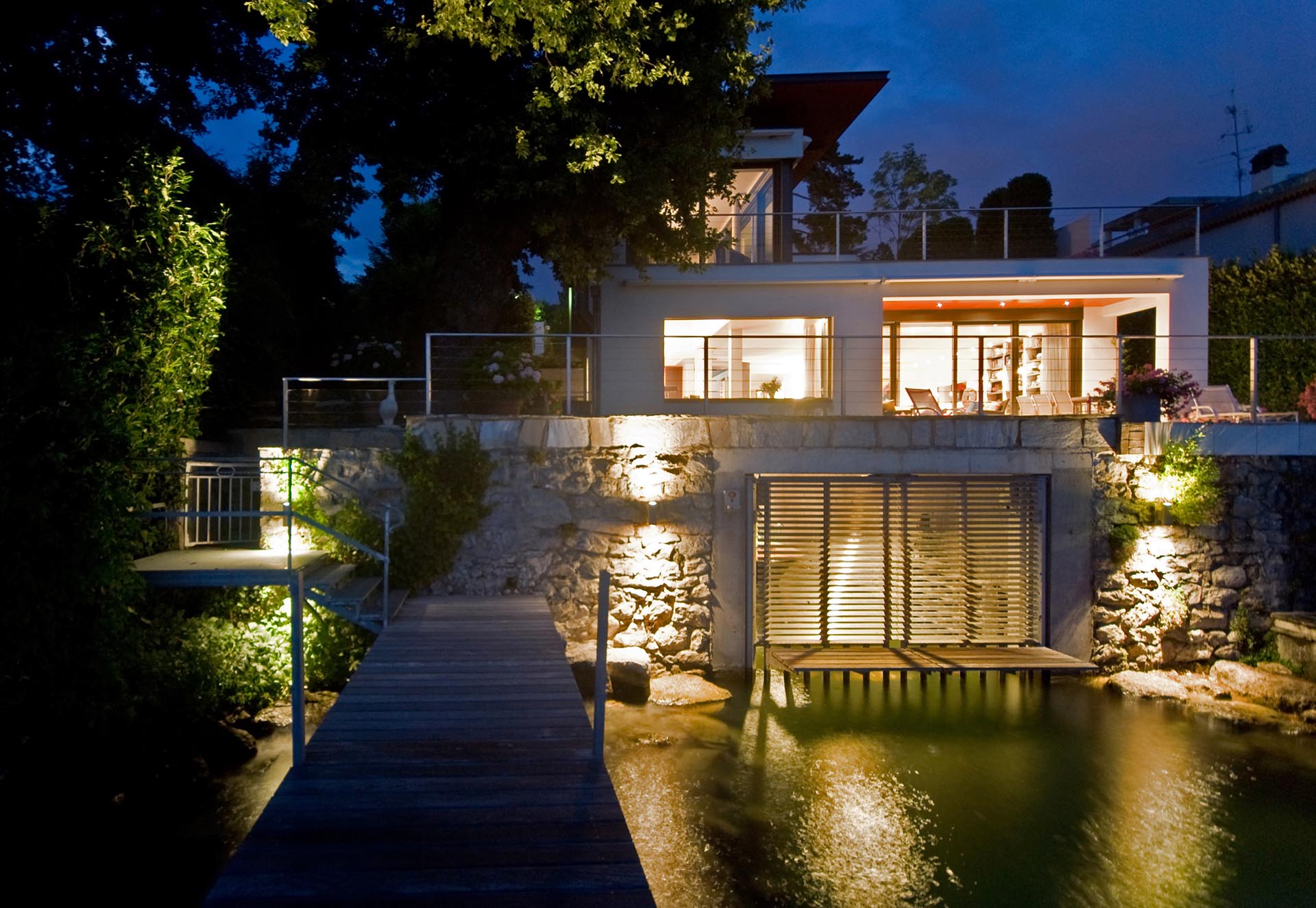 L’accès par la route de Thonon est discret. Passé le mur et le portail de la propriété, on découvre la maison en contrebas protégée des nuisances sonores de la route et s’ouvrant sur le lac. La transition se fait par la découverte d’un jardin structuré et sensible qui dialogue avec le bâtiment.
