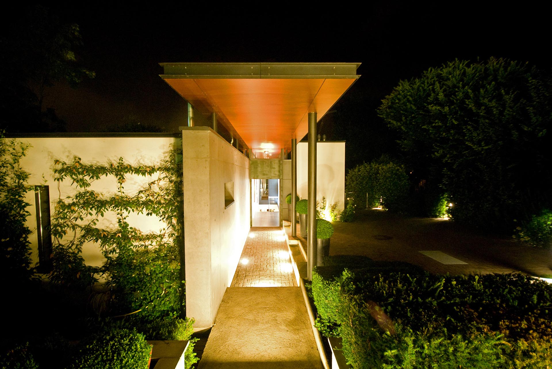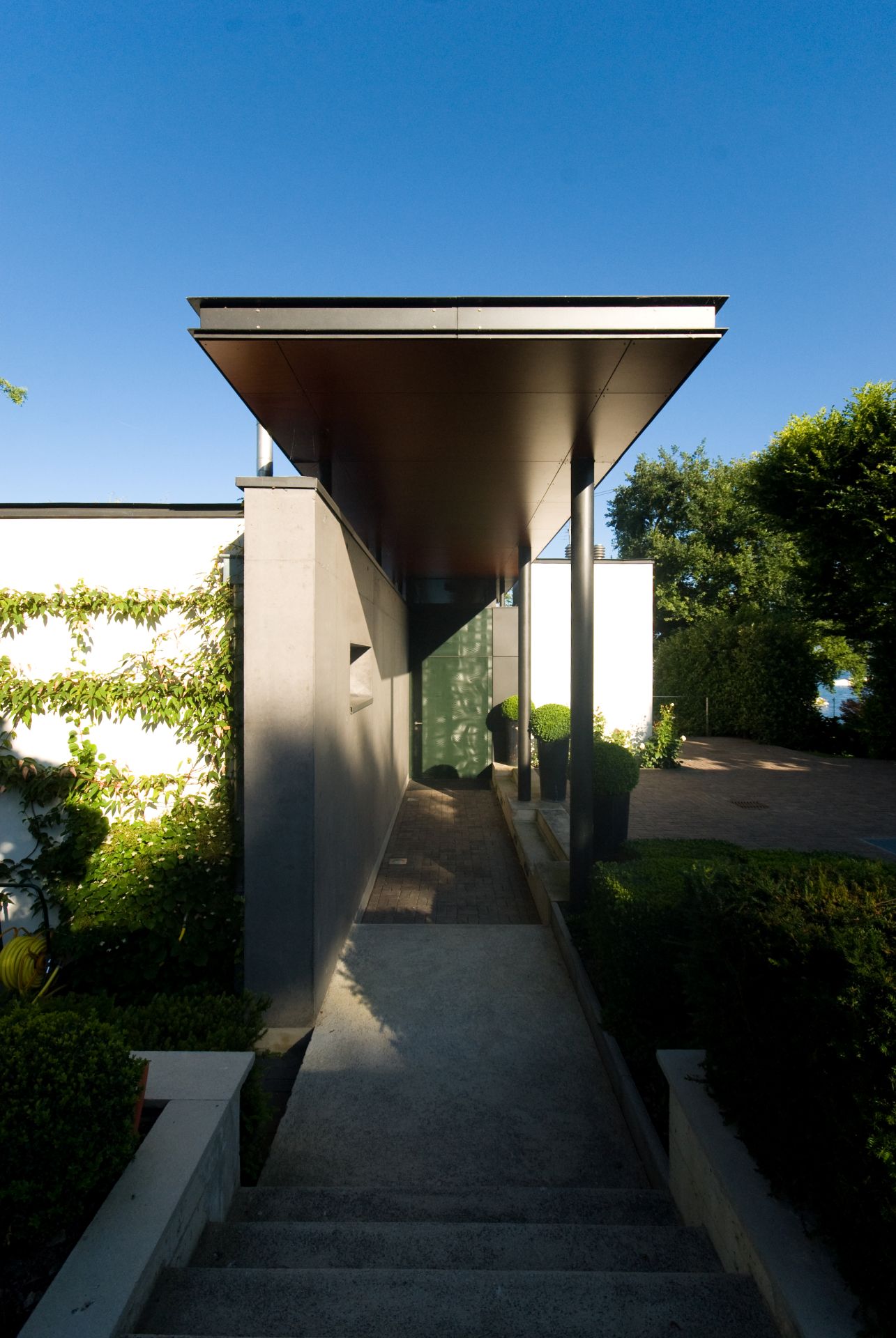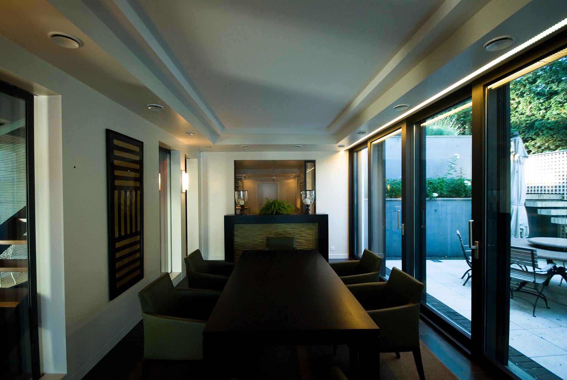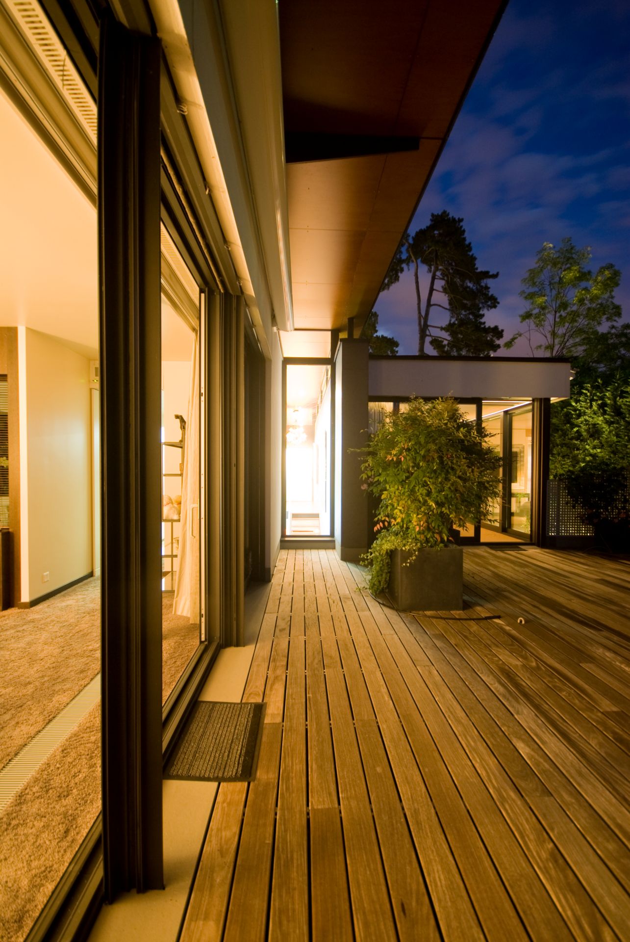 L’accès par la route de Thonon est discret. Passé le mur et le portail de la propriété, on découvre la maison en contrebas protégée des nuisances sonores de la route et s’ouvrant sur le lac. La transition se fait par la découverte d’un jardin structuré et sensible qui dialogue avec le bâtiment.