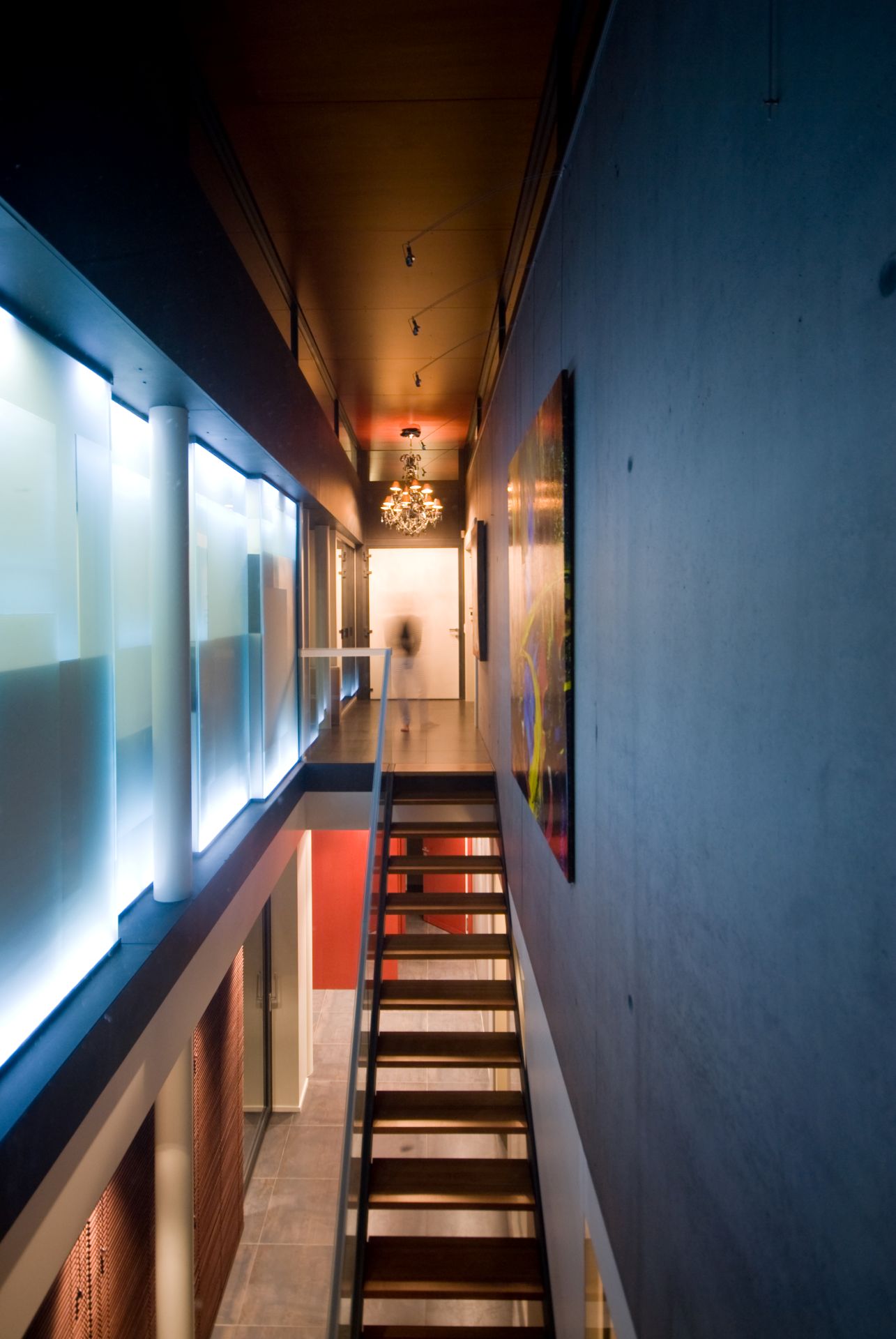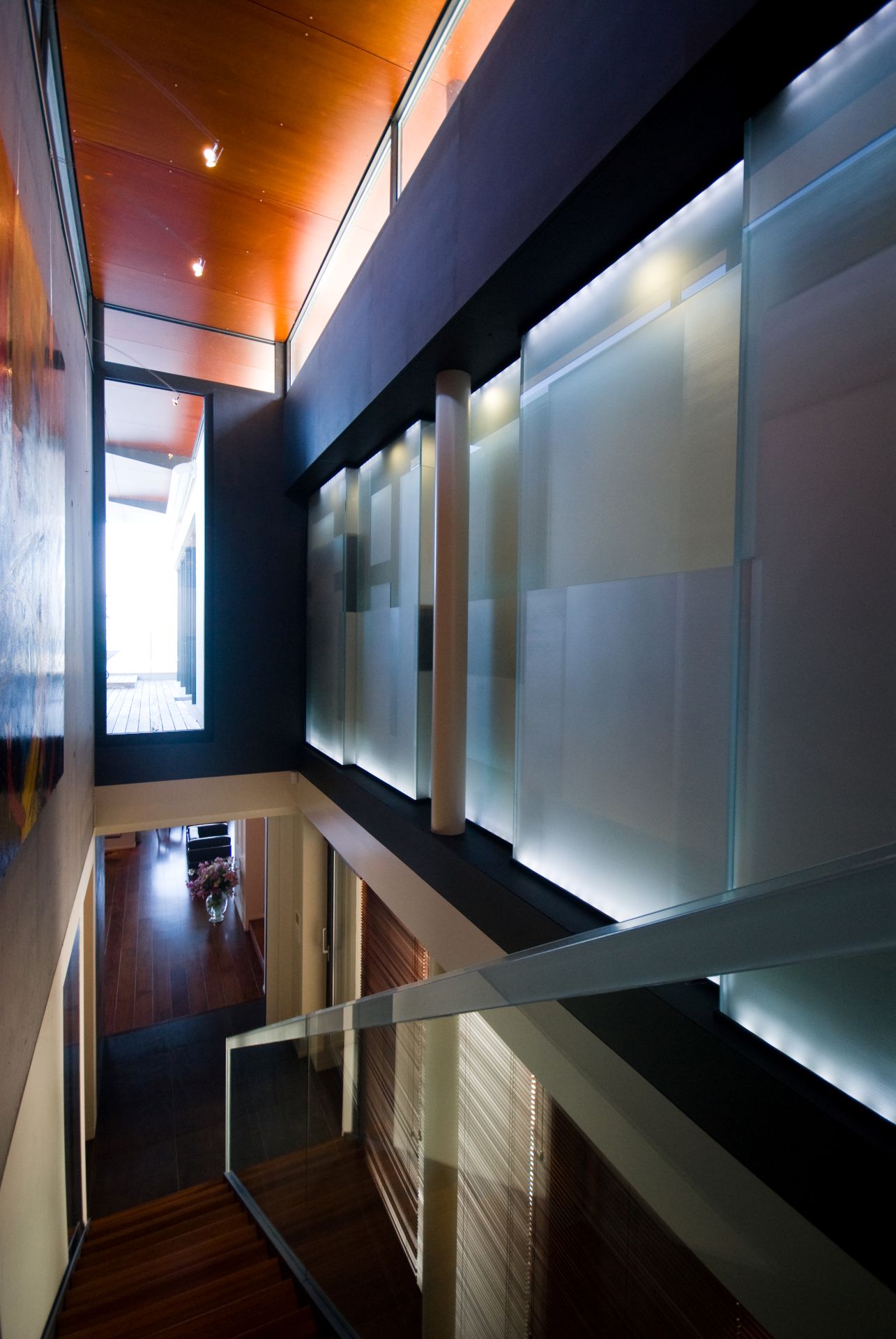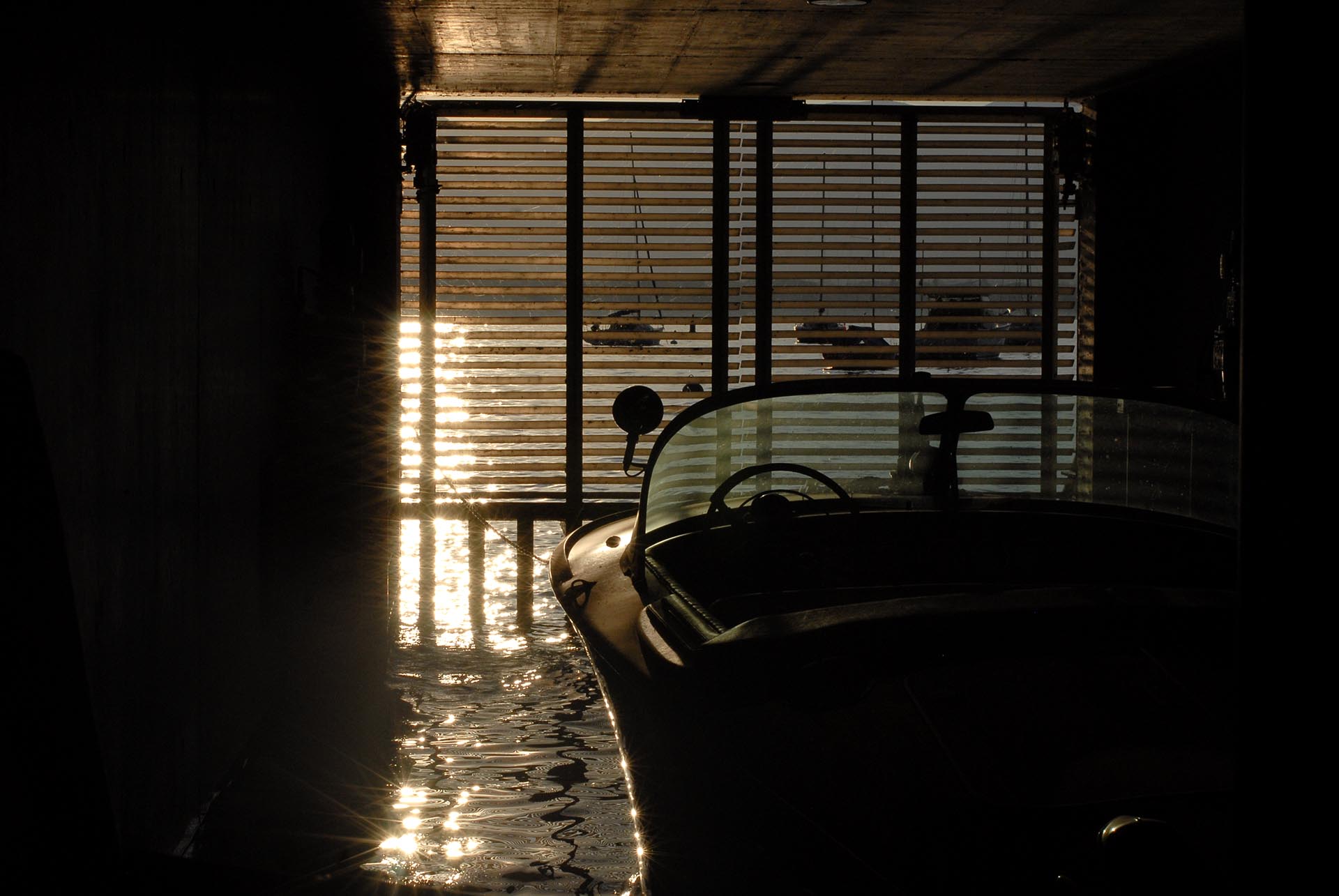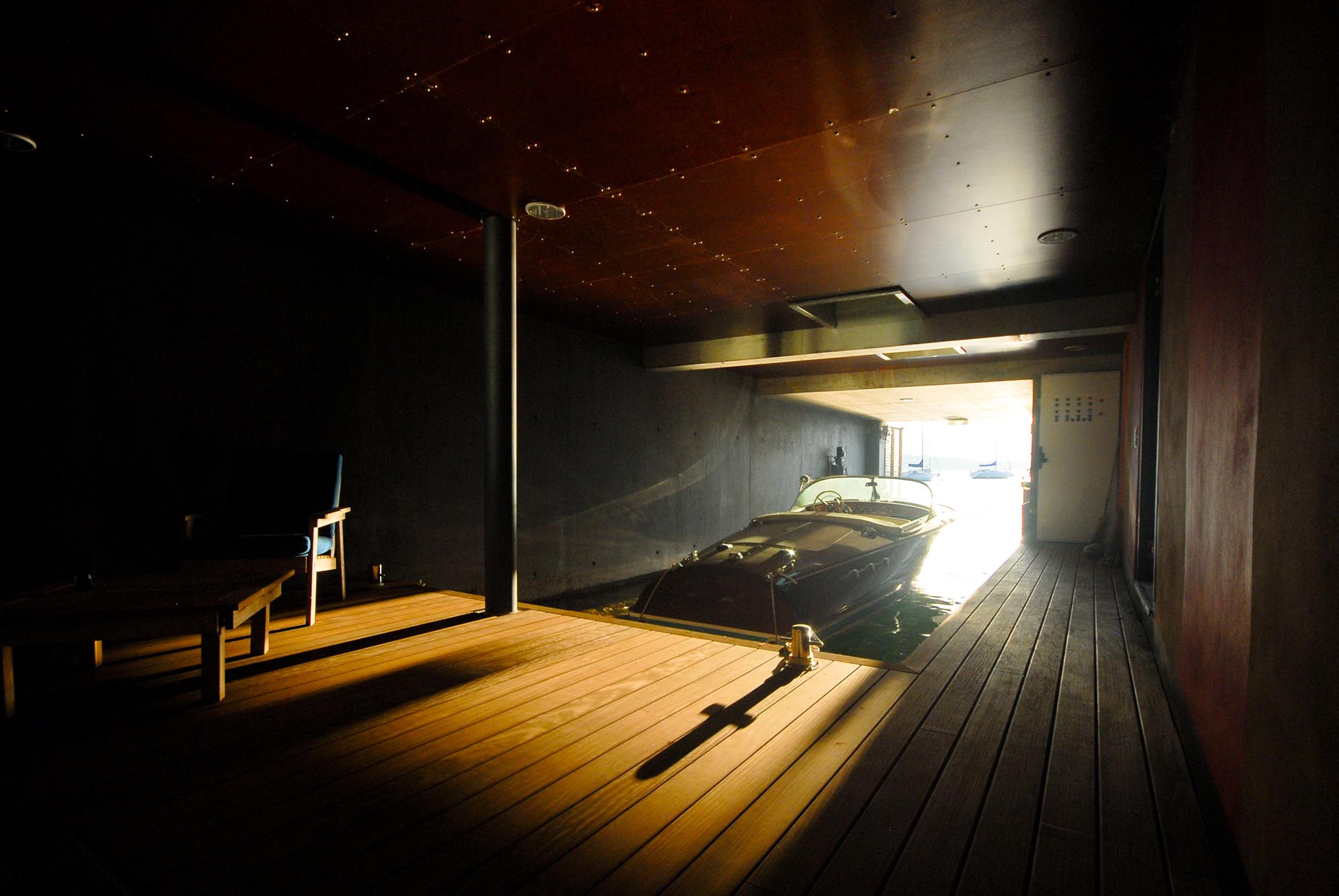 La maison construite directement sur le lac dispose au sous-sol d’un garage à bateau. Un système d’écluse permet de maintenir un niveau d’eau constant à l’intérieur de celui-ci.