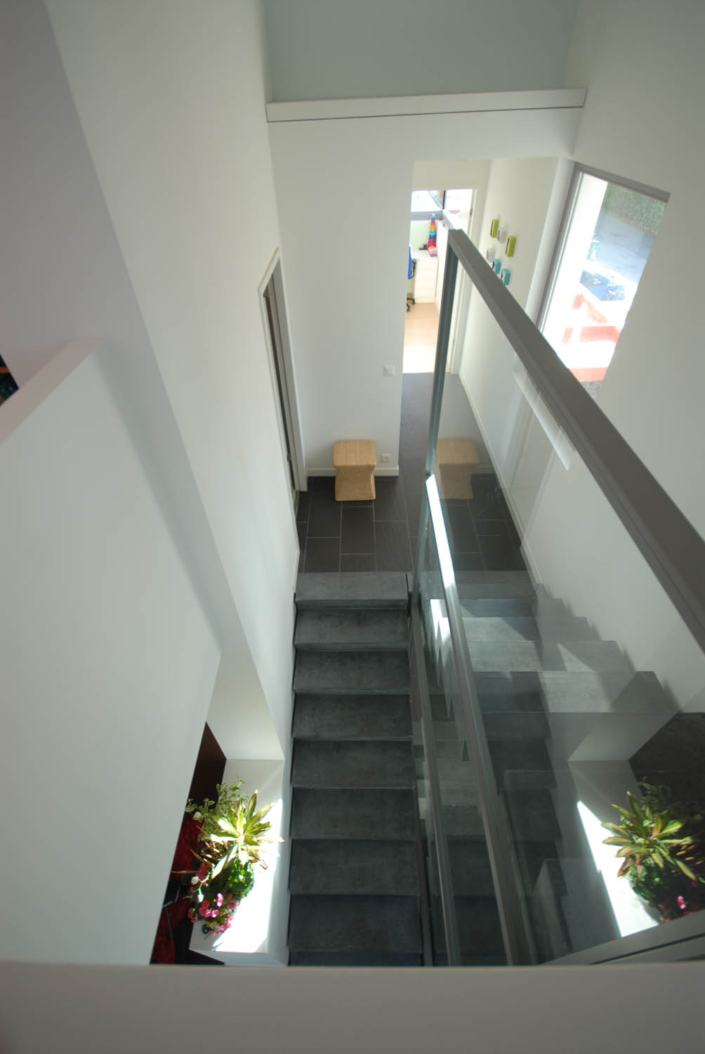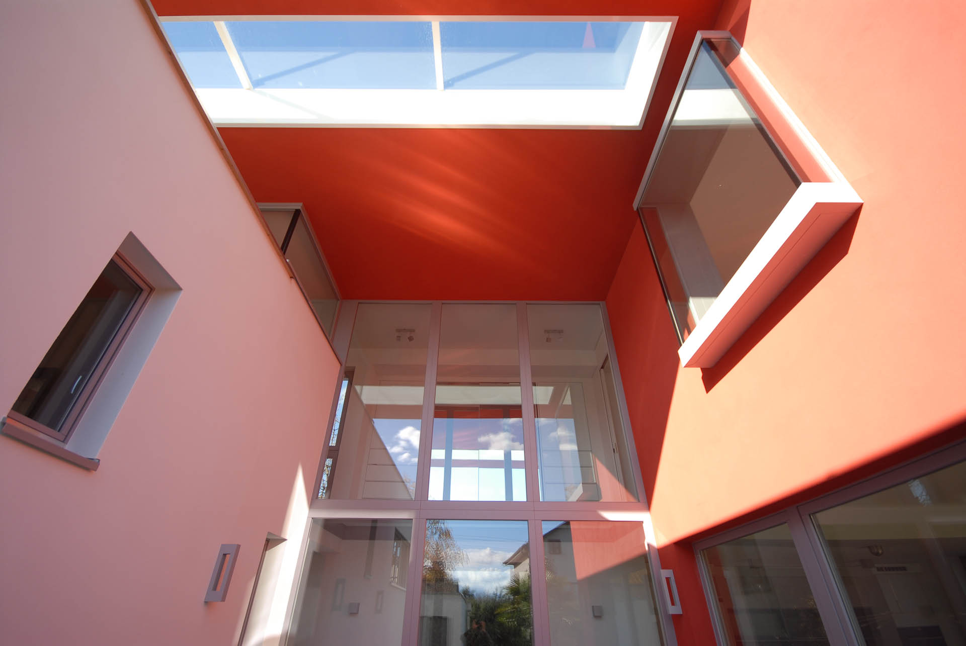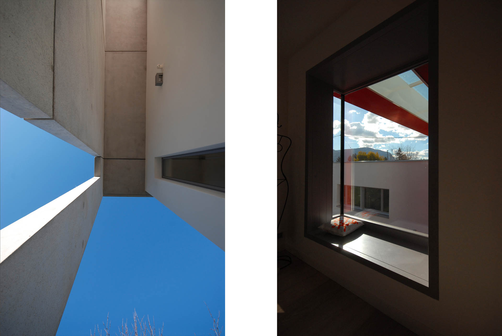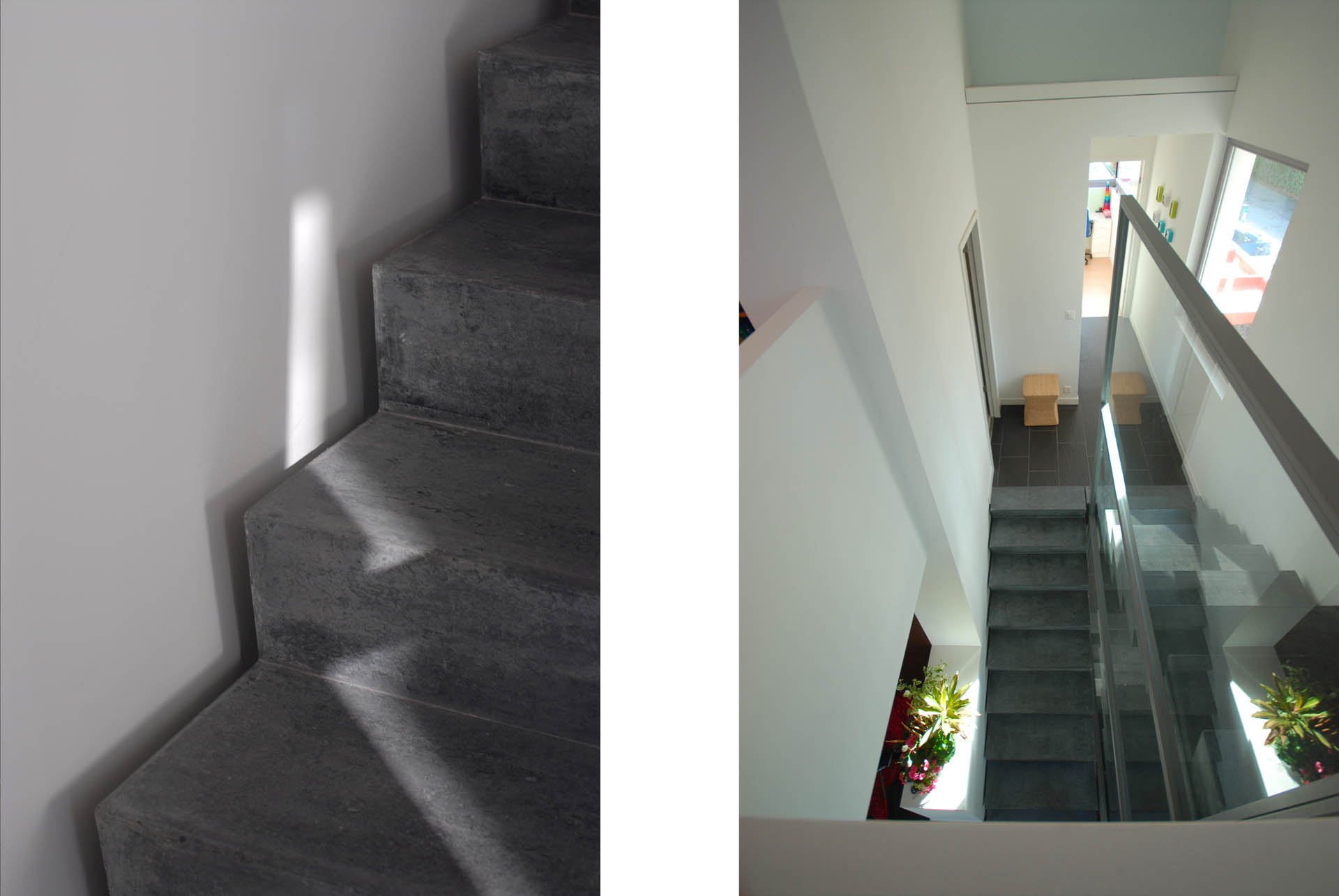 Sa distribution verticale en demi-niveaux permet d’exploiter des espaces semi enterrés profitant de jours naturels en privilégiant les relations intérieures – extérieures.